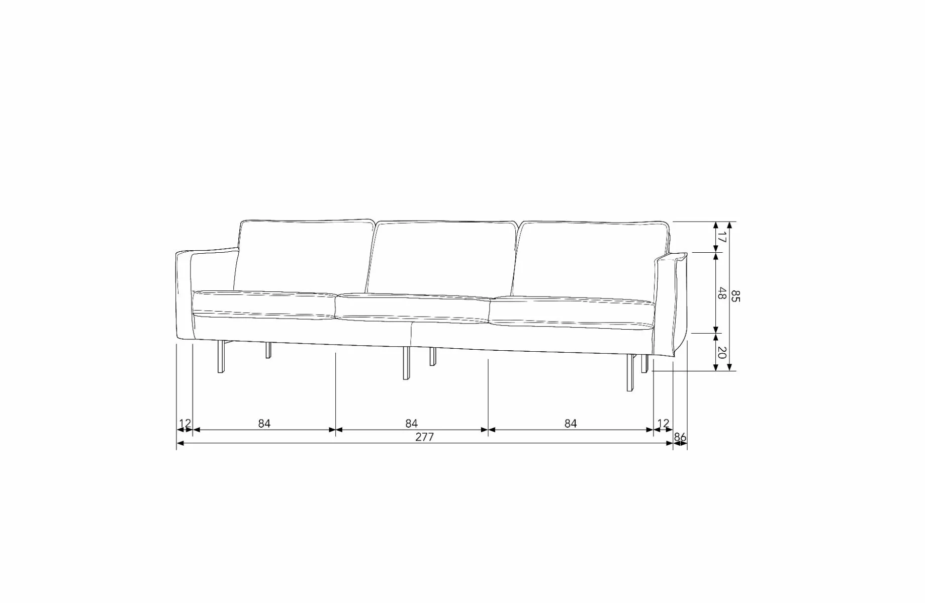Rodeo 3-seters sofa har en total høyde på 85 cm, bredde på 277 cm og dybde på 86 cm. Setehøyden er 45 cm og setedybden er 60 cm, noe som gir god støtte. Setebredden på denne 3-seteren er 253 cm og er delt inn i tre separate sete- og ryggputer. Armlenene har en bredde på 12 cm og en høyde på 68 cm, målt fra gulvet. Metallbena er 20 cm høye. Sofaen kan bære 250 kg jevnt fordelt.
