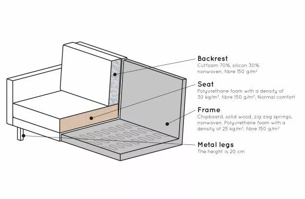 Benen är gjorda av svart metall. Sitthöjden är 45 cm, sitsbredden är 274 cm (120 cm från lungstolens del), sittdjupet är 60 cm (125 cm från lungstolens del) och armstödens höjd är 67 cm.