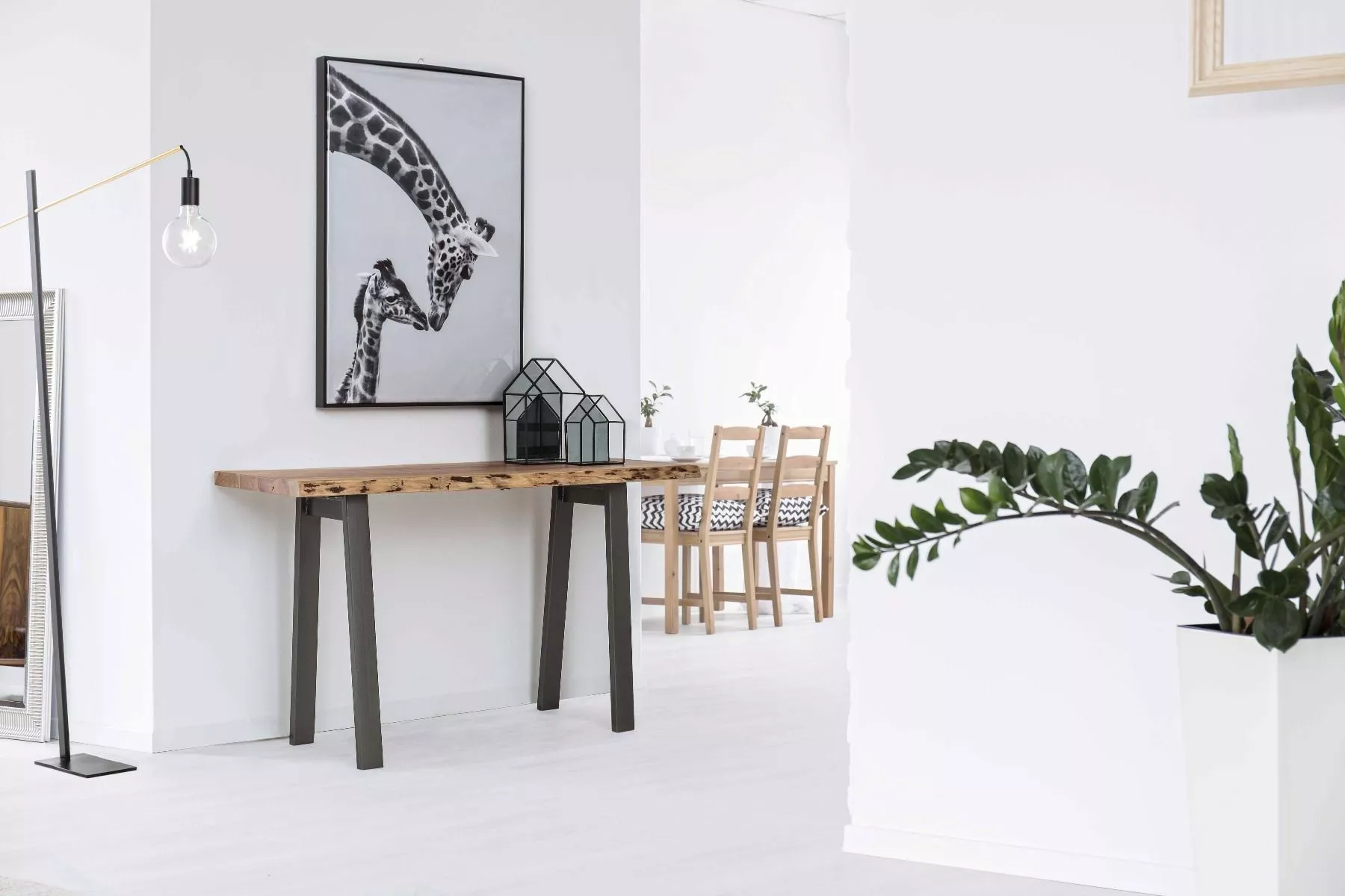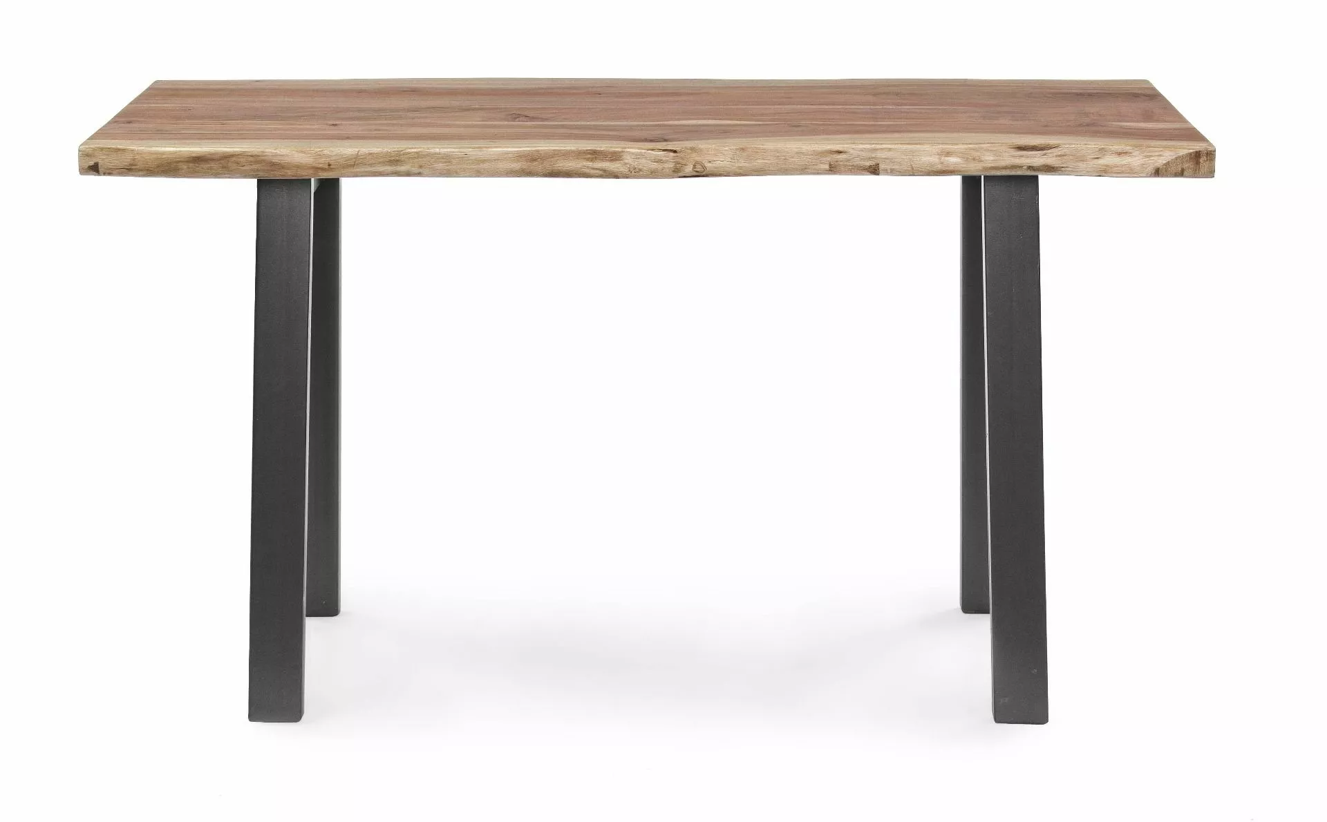 Stålben epoxy pulverlakkert. topp i akasietre med uregelmessige kanter (levende treeffekt). etterbehandling av polyuretanmaling. siden toppen er bearbeidet for hånd, er formene og størrelsene som dannes av treet bare veiledende, alle elementene vil være forskjellige fra hverandre. ben som skal monteres
