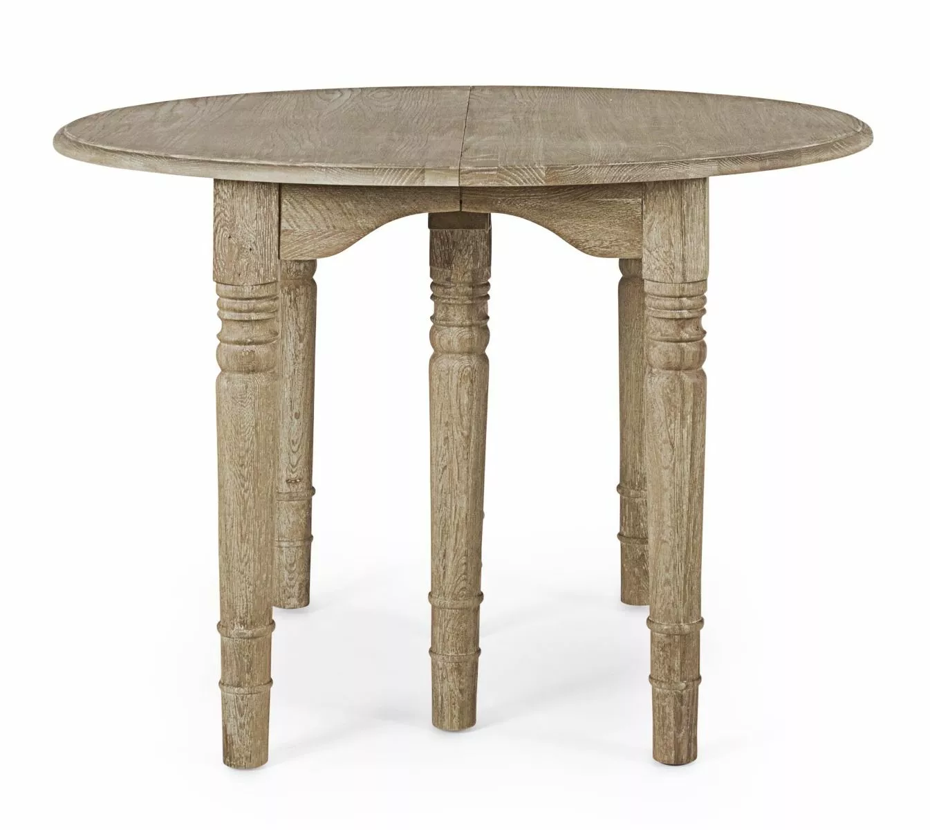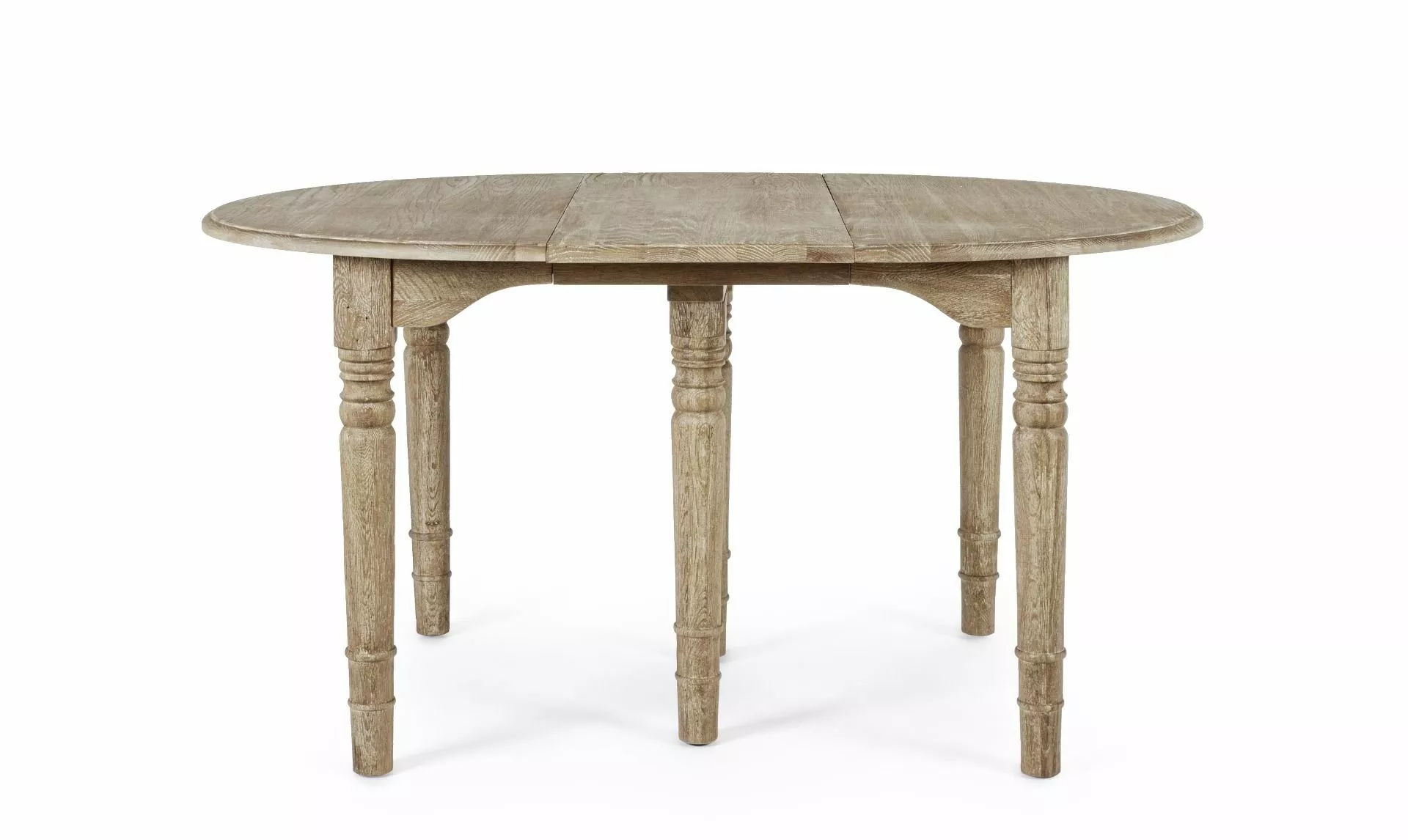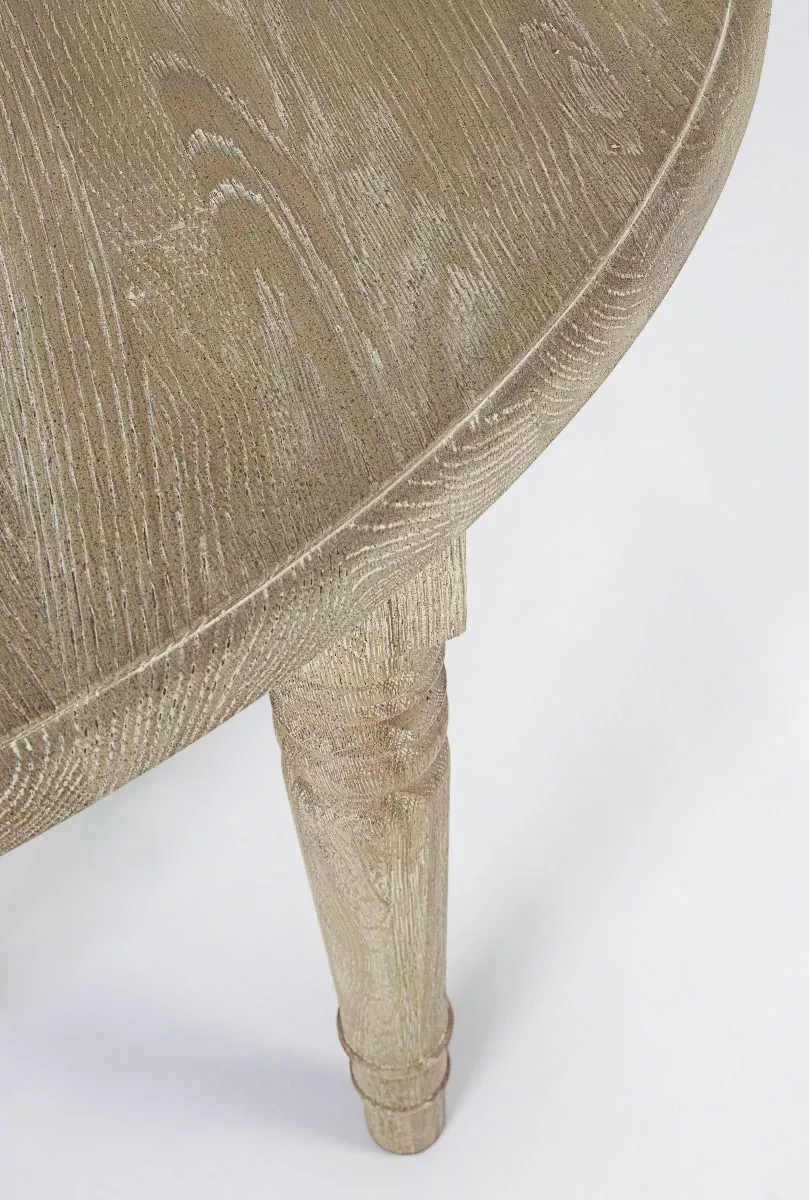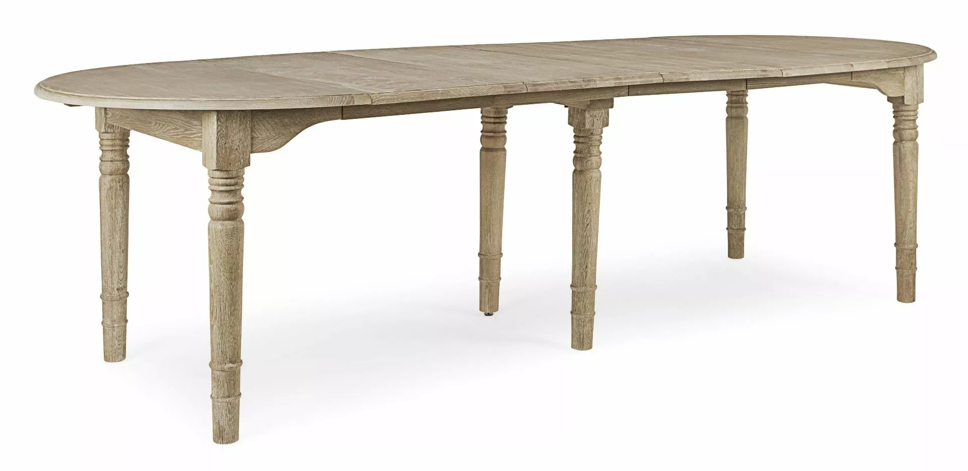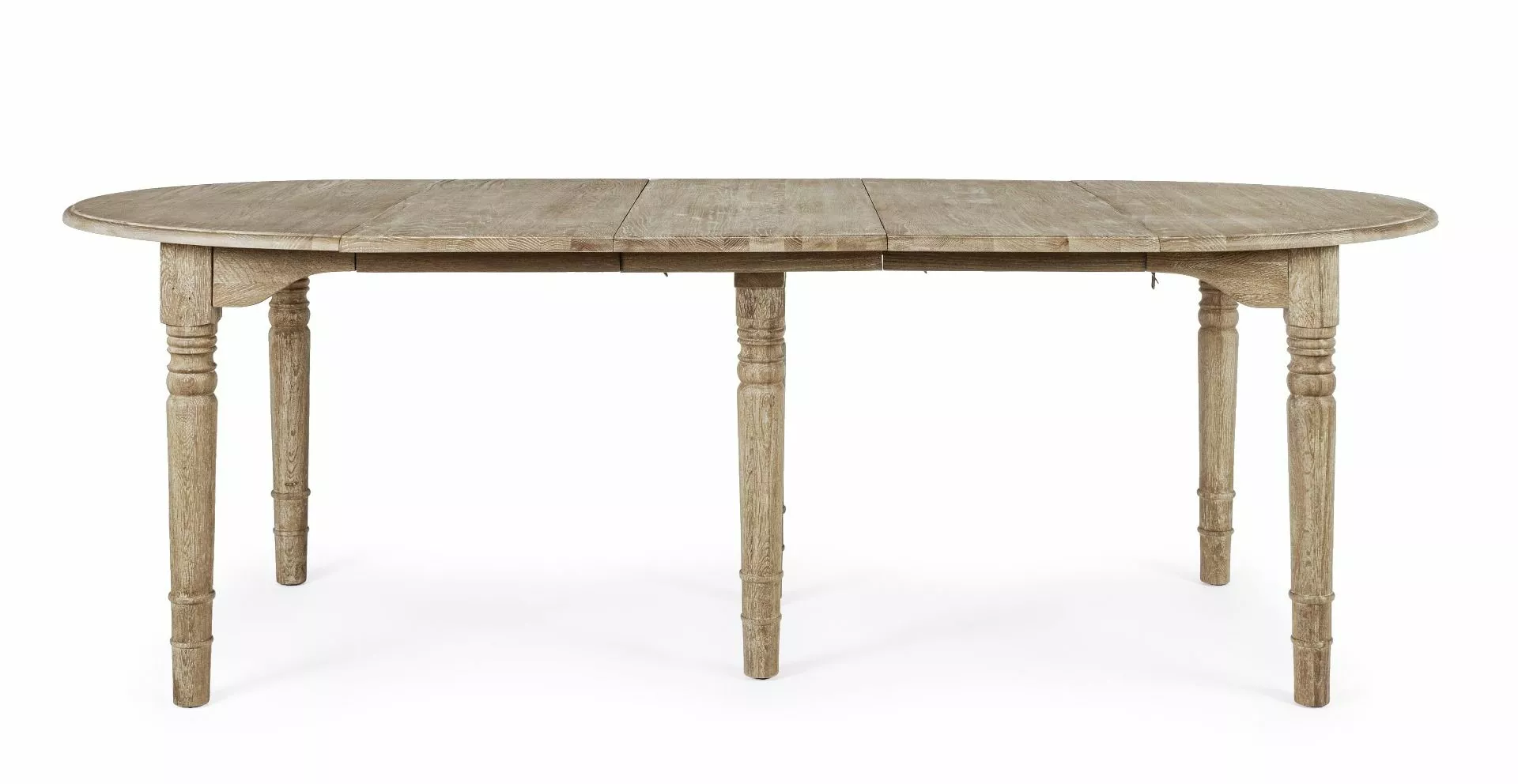 Massiv europeisk eik, vannbasert maling med alderseffekt og voksfinish. Ø110 cm slått sammen. 272×110 helt åpnet. 4 eksterne utvidelser på 40,5 cm. skal monteres