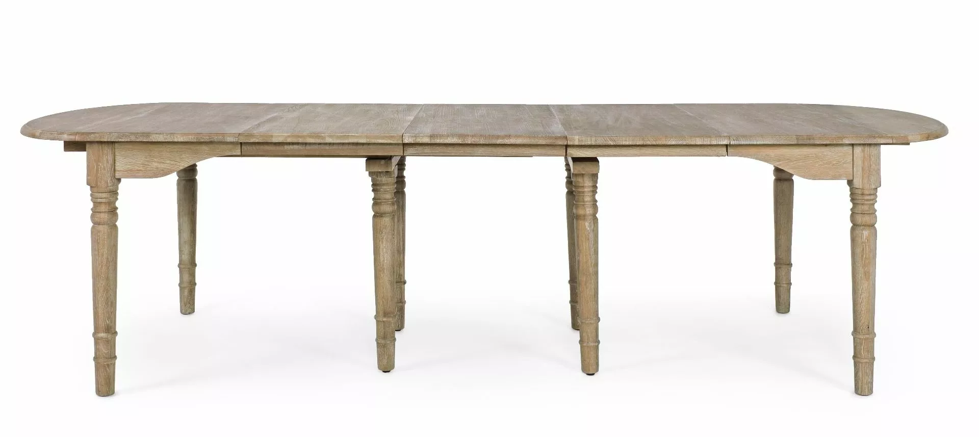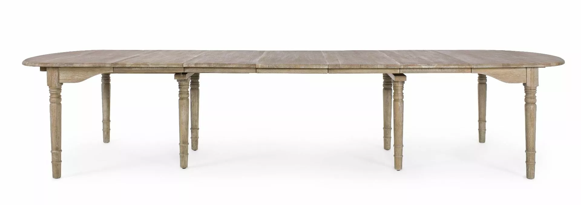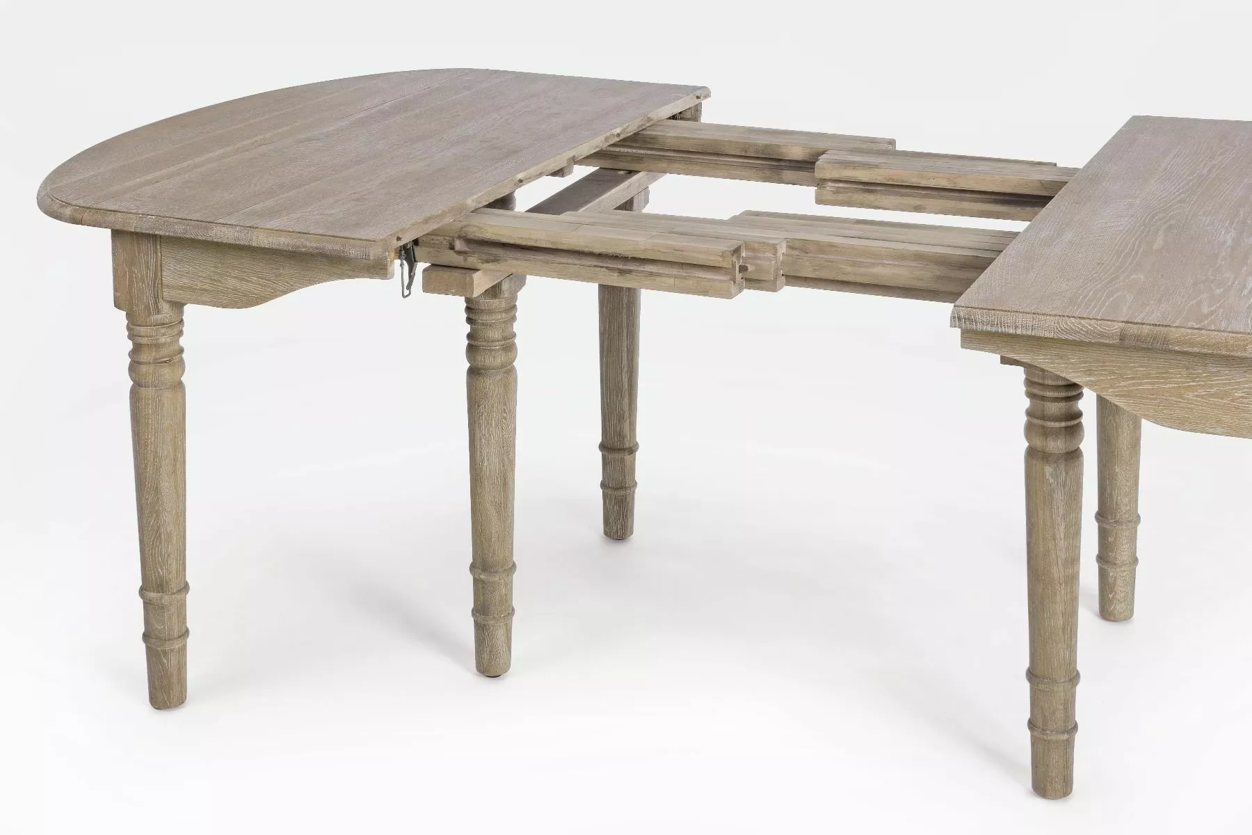Massiv europeisk eik, vannbasert maling med alderseffekt og voksfinish. Ø110 cm slått sammen. 272×110 helt åpnet. 4 eksterne utvidelser på 40,5 cm. skal monteres
