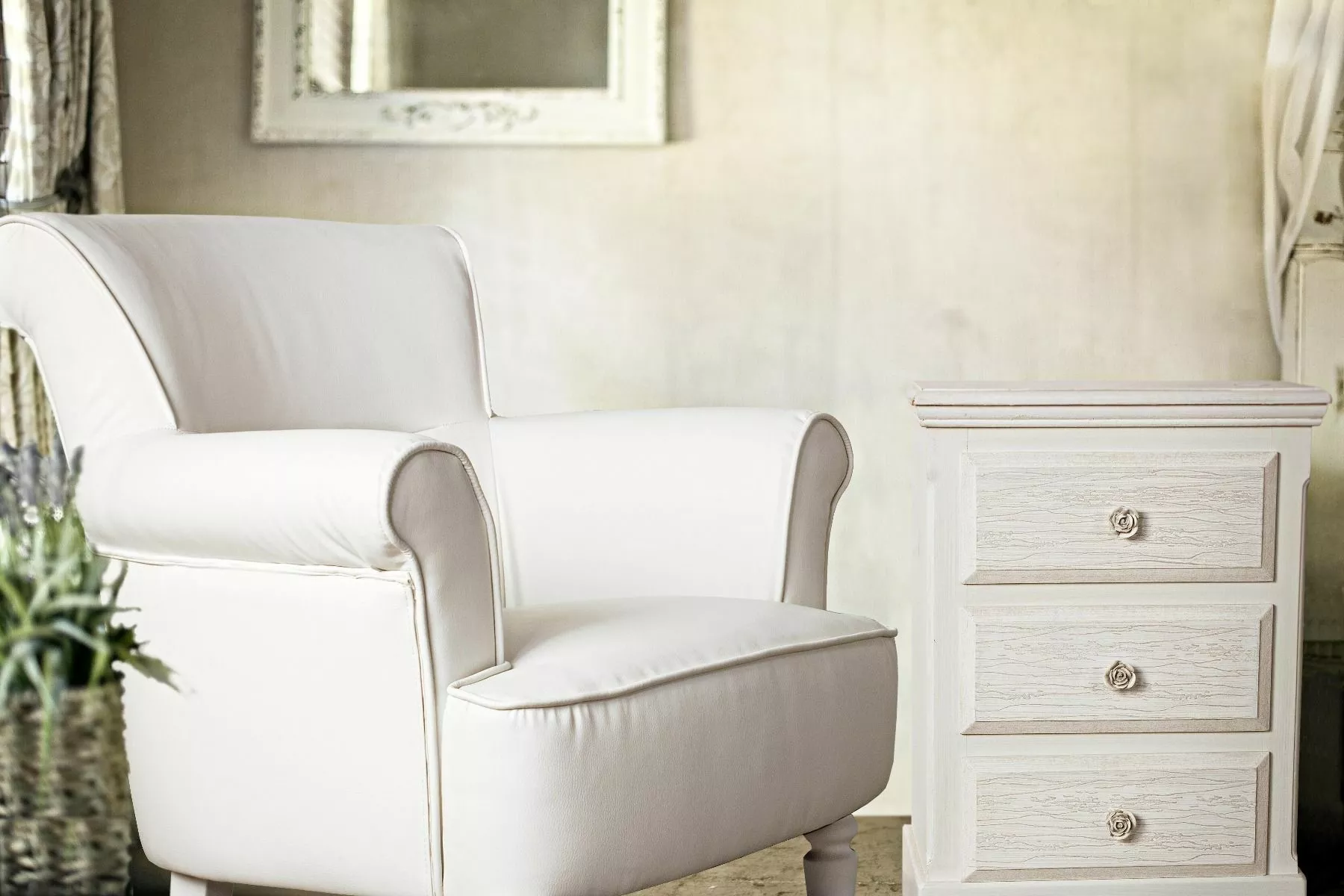 Mdf. matt hvit finish, fronter og topper med bleket effekt. polyresin håndtak.