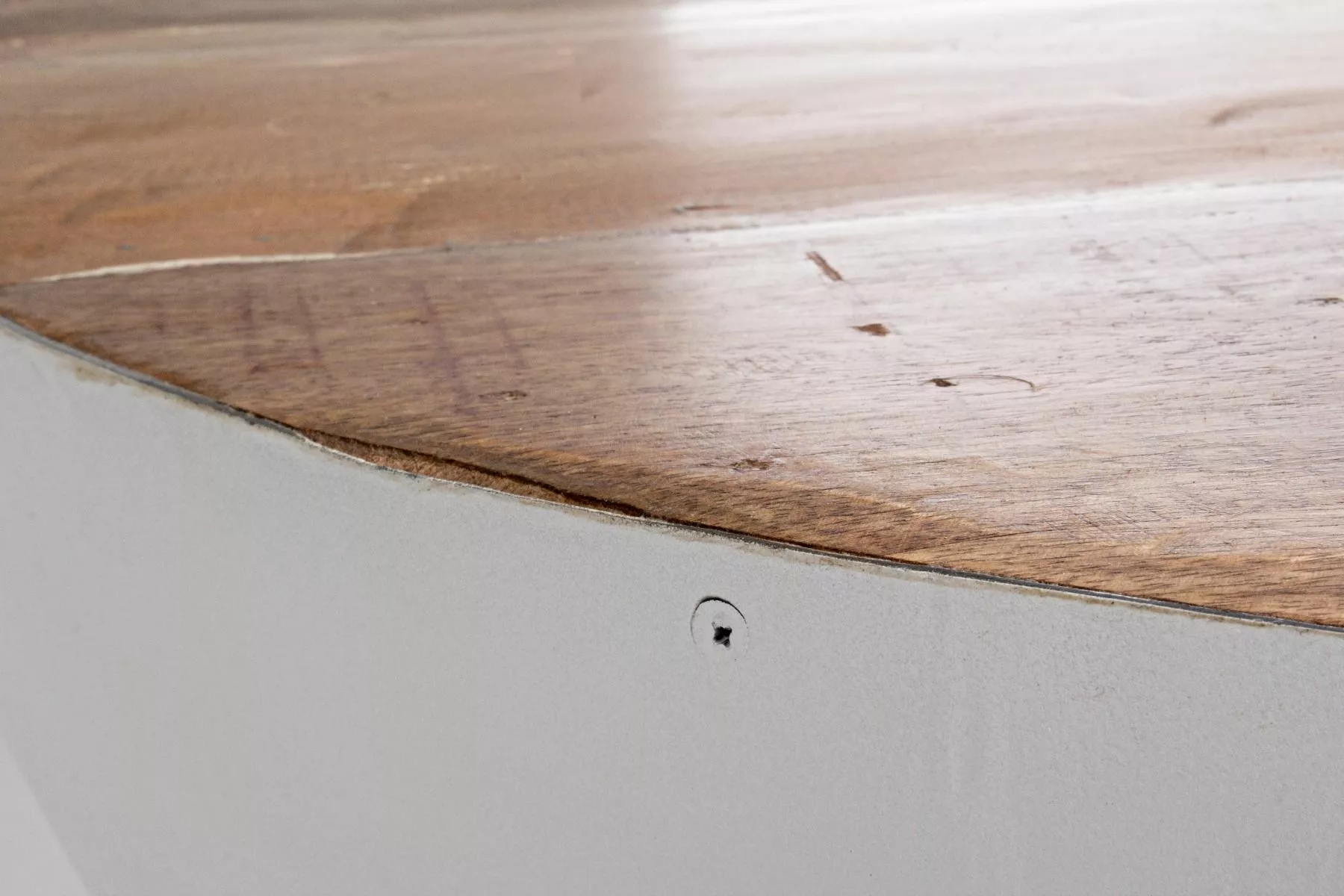 Resirkulert originalfot av stål, topp i resirkulert tre. etterbehandling av nitrocellulose. gjenbruket tre er preget av tilstedeværelsen av tre dybler av forskjellige arter og farger. noen splittelser, sprekker eller ufullkommenheter, som også kan generere over tid, er materialets trekk og gjør hvert stykke unikt og originalt.