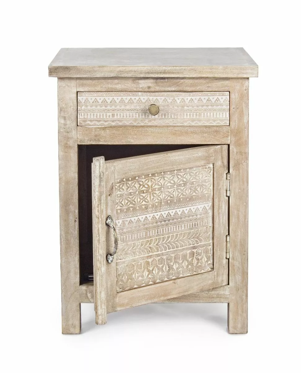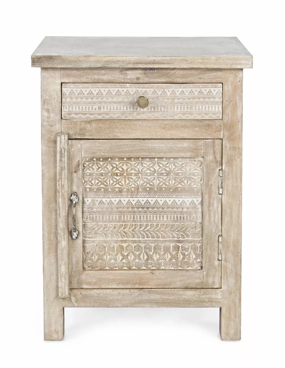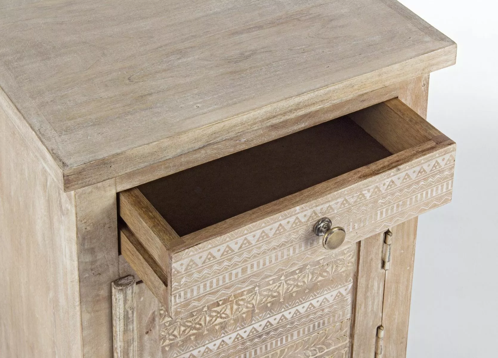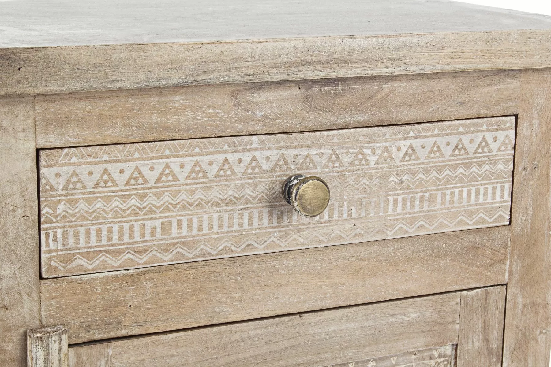 Mango treramme med håndlagde utskårne dekorasjoner, bak- og bunnskuffer i mdf. etterbehandling av nitrocellulose. messing knotter.