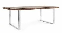 Resirkulert treplate. naturlig etterbehandling. herdet glass. ben i rustfritt stål. siden toppen er i resirkulert tre med lameller som ikke er glatte, kan dette føre til en ikke perfekt vedheft mellom topp og glass. gjenbruket tre er preget av tilstedeværelsen av tre dybler av forskjellige arter og farger. noen splittelser, sprekker eller ufullkommenheter, som også kan generere over tid, er trekk ved dette materialet og gjør hvert stykke unikt og originalt. ben som skal monteres.