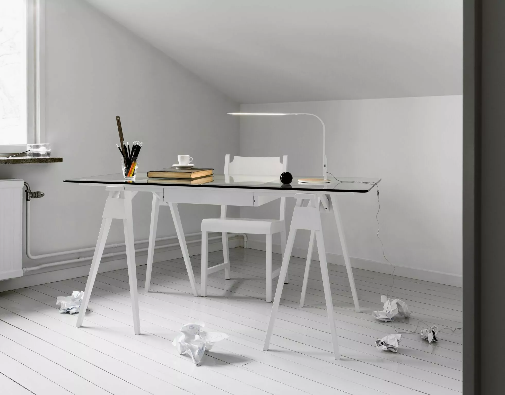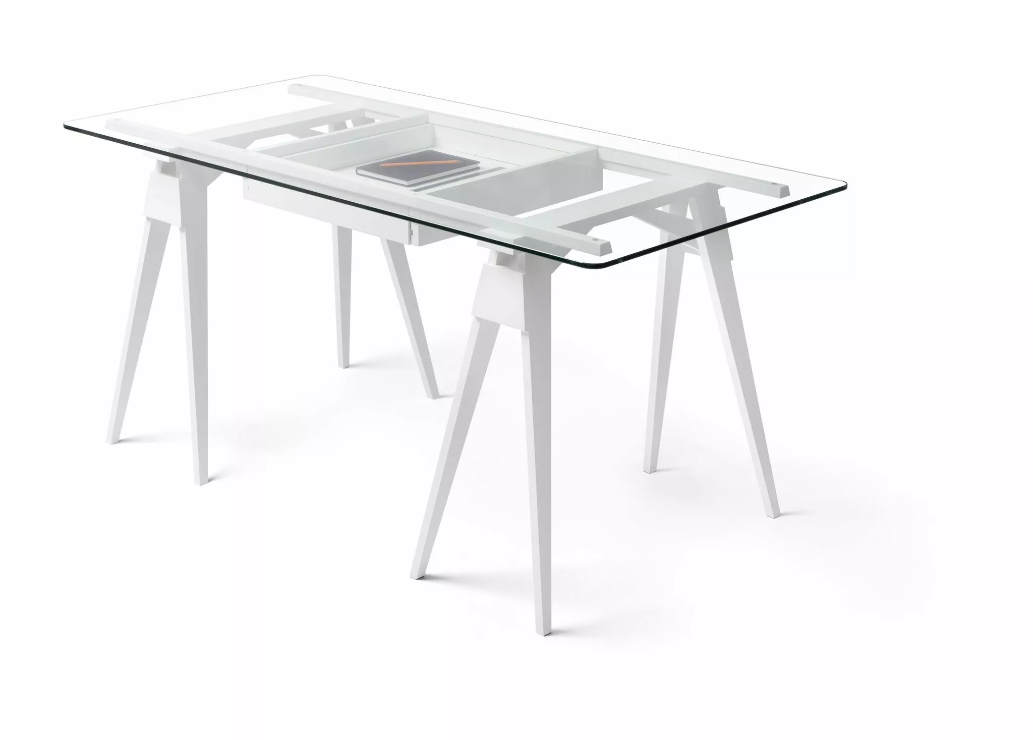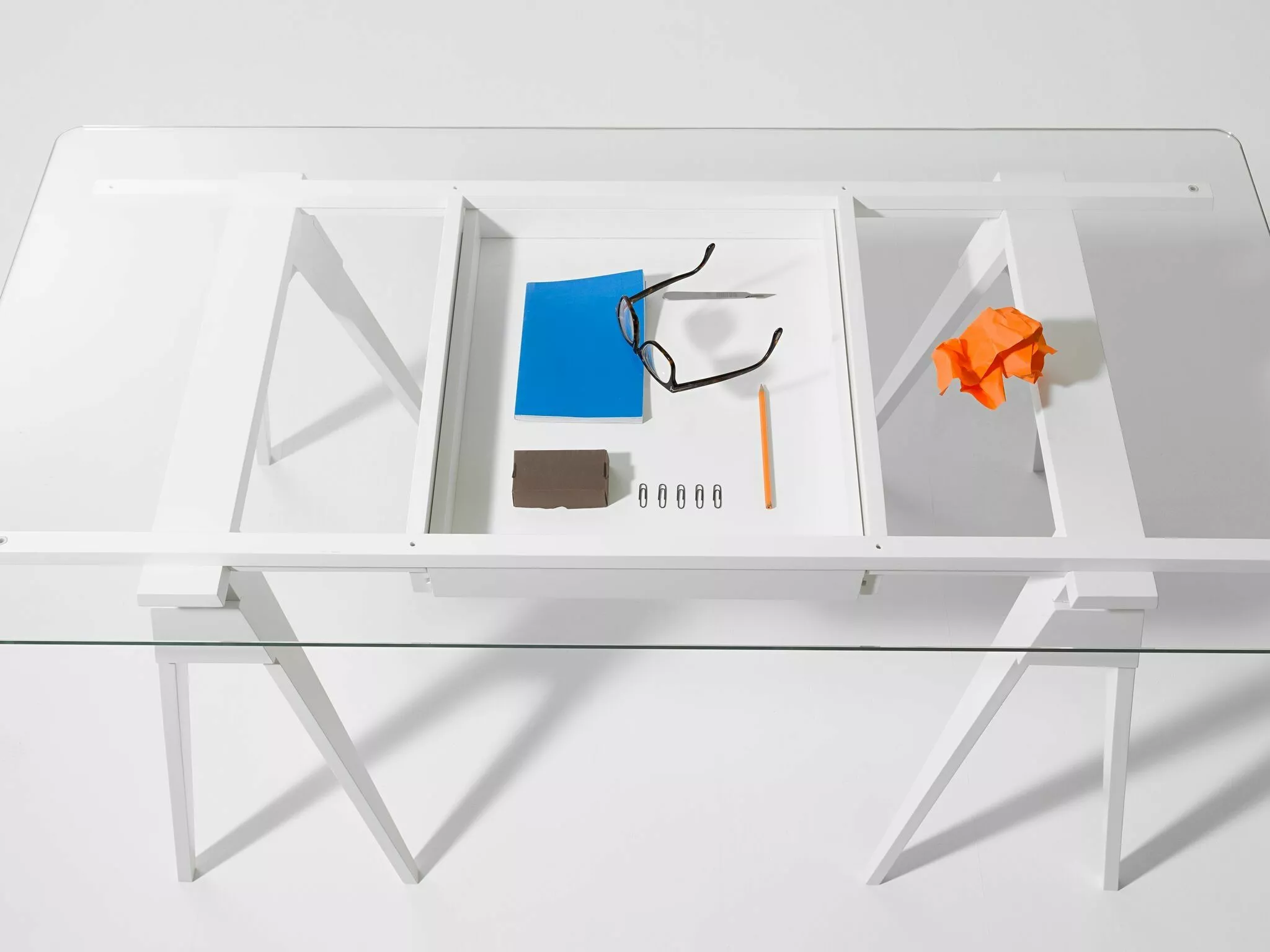 Isländska amerikanska Chuck Mack har skapat ett skrivbord som stöds på bockar med bänkskivor av härdat glas som gör innehållet i lådorna synligt för alla. Lackerat massivt trä. Härdat säkerhetsglas med runda hörn och kantkanter. Lådan öppnas från varje sida. Torka av med en fuktig trasa. Gjord i Thailand.