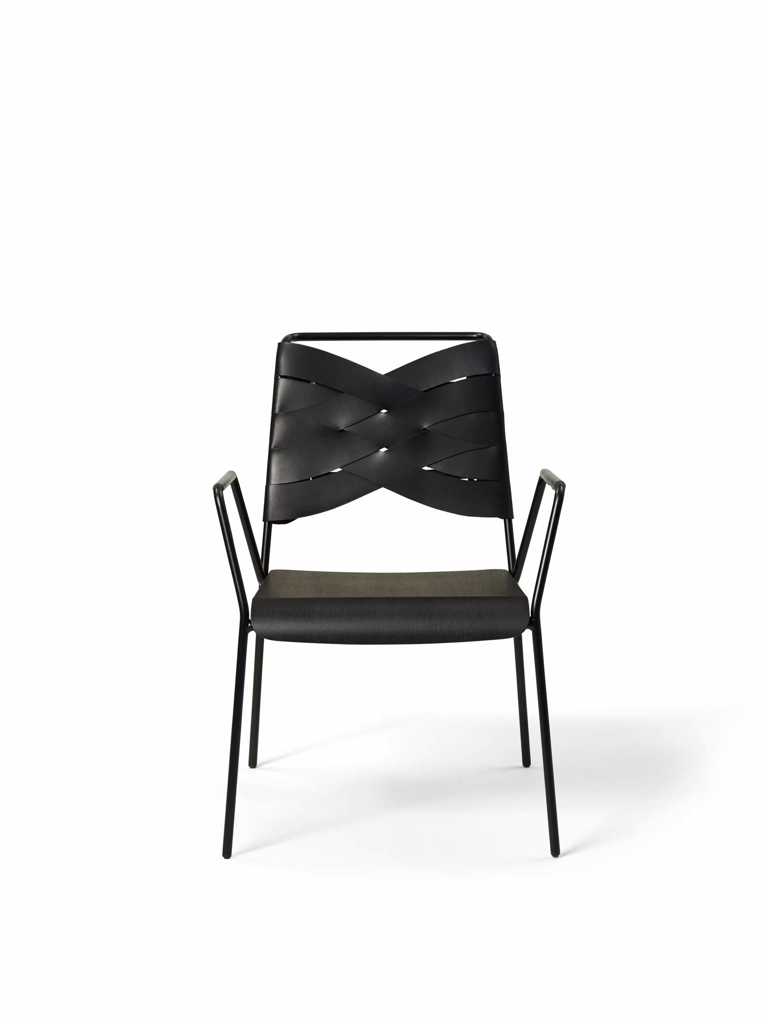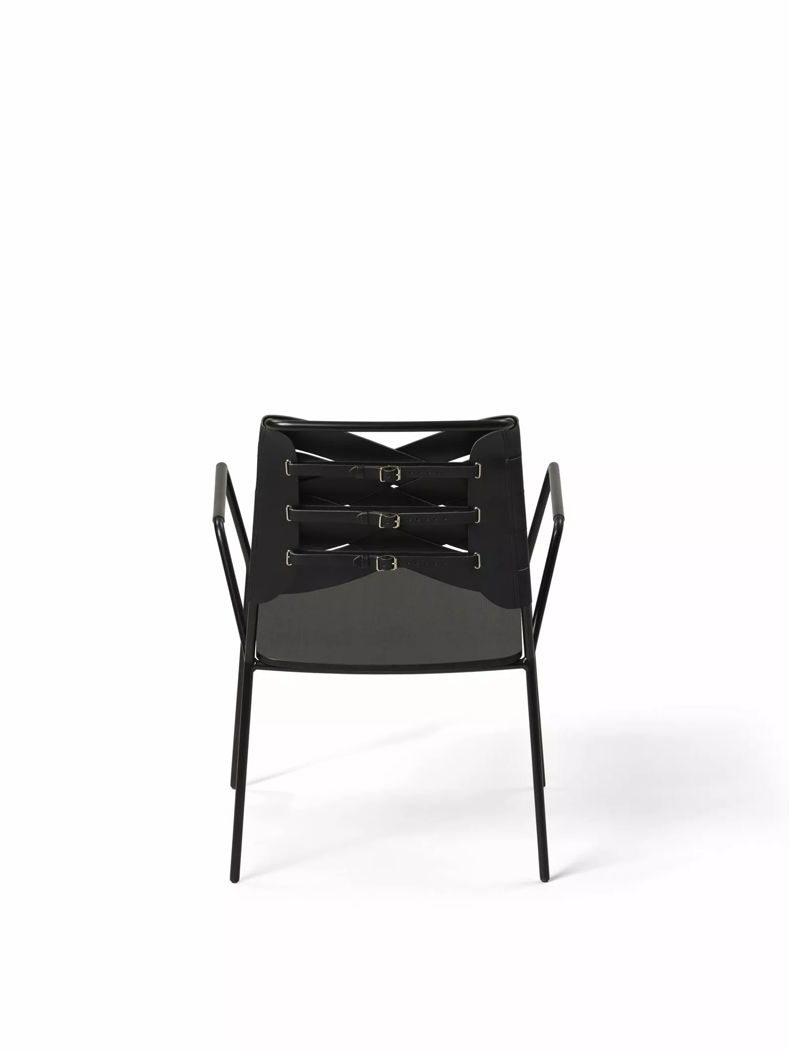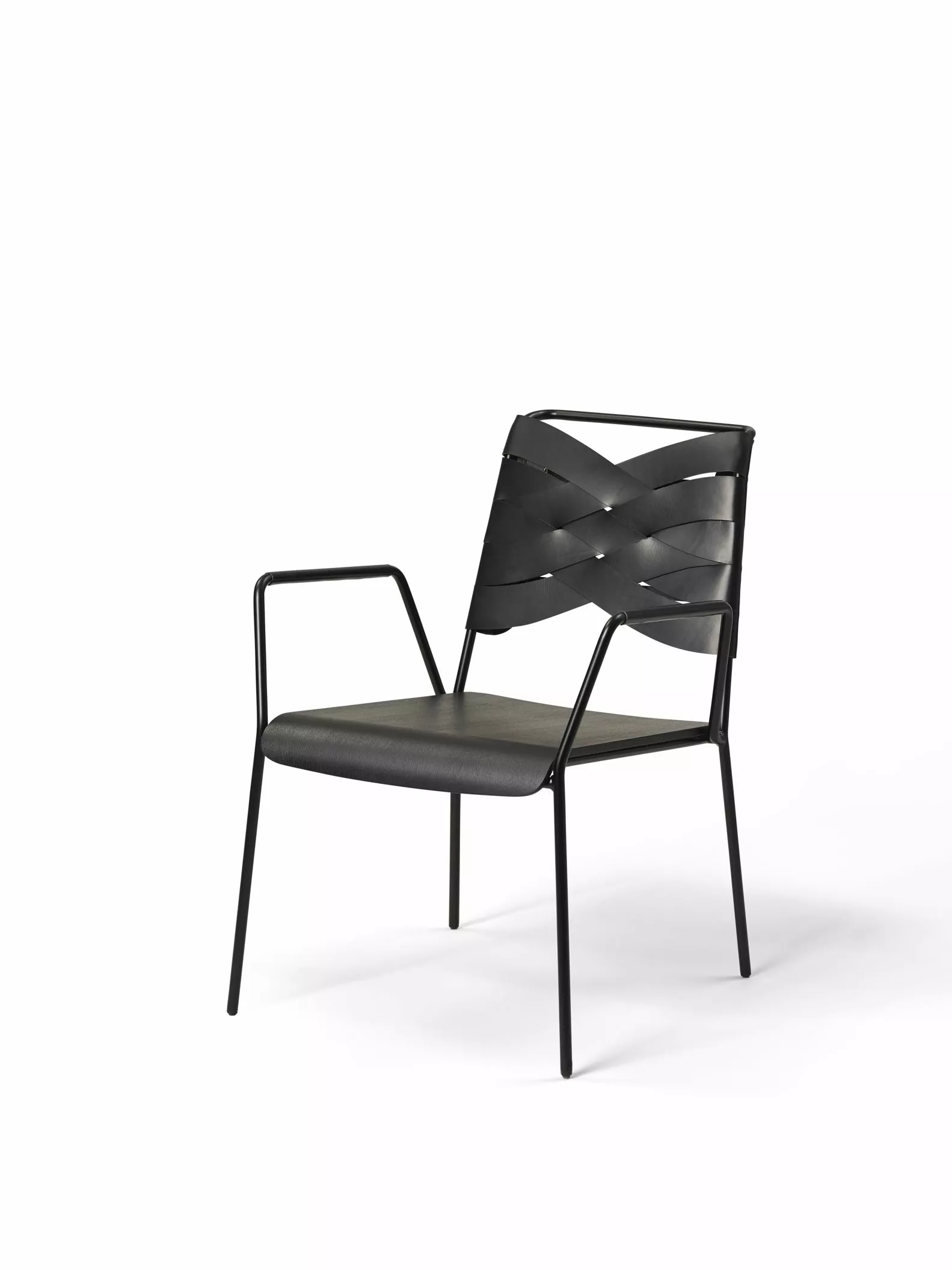 Pulverlackerad stålram, formpressad sits i ask / fanér, ryggstöd i läder.