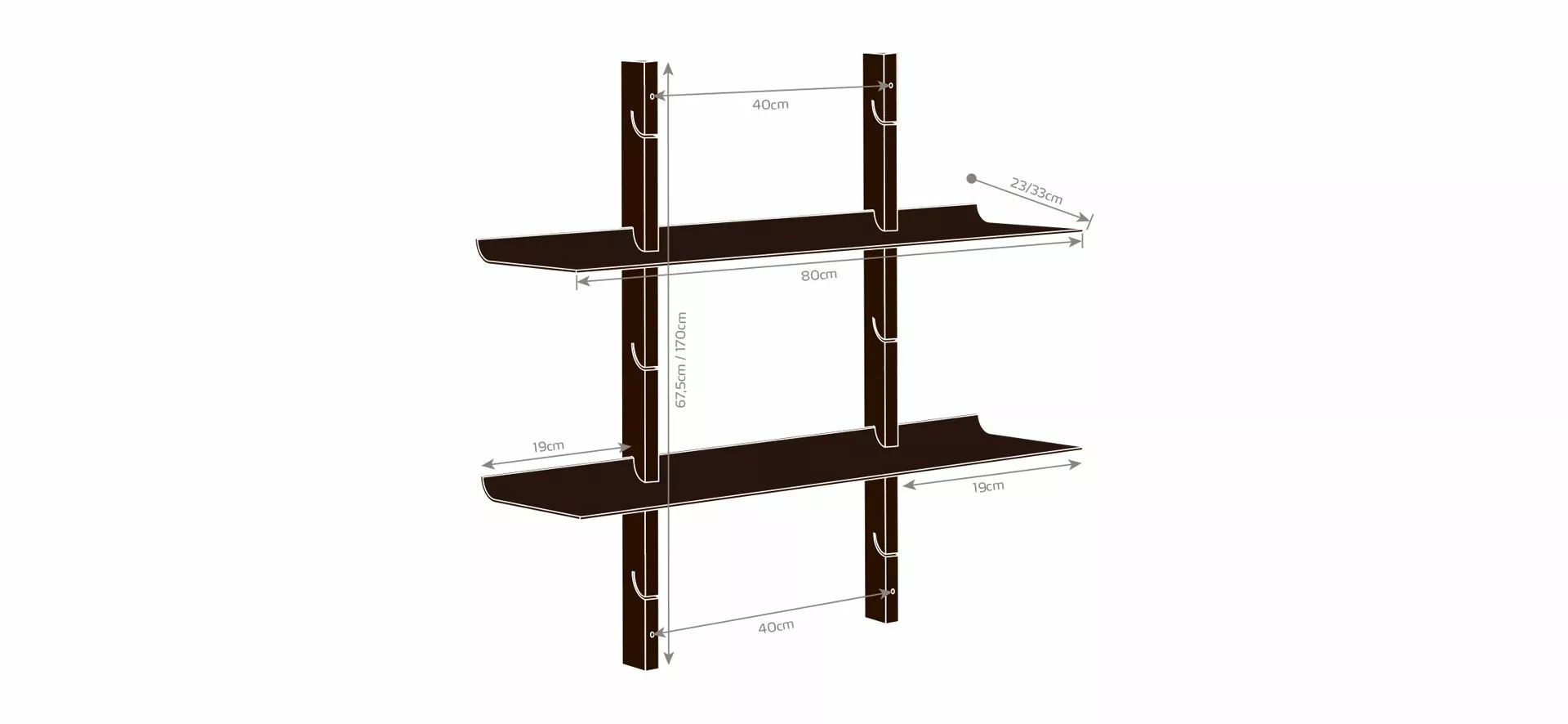 Dette settet består av to korte vanger på 67,5 cm og to hyller som er 79,6 cm brede og 20 cm dype.