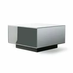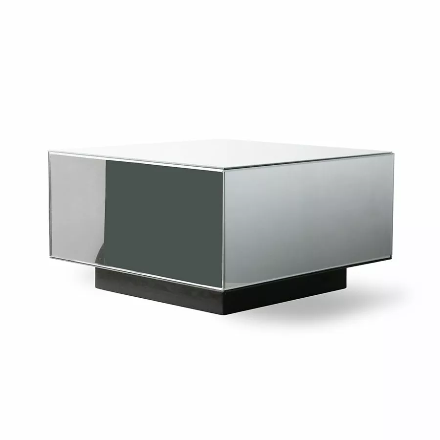 Sofabord fra HKliving dekket med svart speilglass. Inspirert av 80-tallet har vi laget to forskjellige typer av dette sofabordet. De kommer i 3 farger: klart-, sort- og lilla speilglass, og i to størrelser: medium og stor.