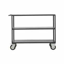 Denna vackra möbel från House Doctor är en kombination av oupprullat hyllsystem och en vagn. Möblerna kan utformas på många olika sätt, så de passar exakt efter dina behov och din personliga stil. Hyllorna är gjorda av svart plywood och basen är gjord av järn. Den konsekventa svarta färgen och den strikta designen ger ett mycket industriellt och minimalistiskt utseende. Hyllorna har en längd på 130 cm. och en bredd på 40 cm. Möblerna i sig är 98 cm. högt.