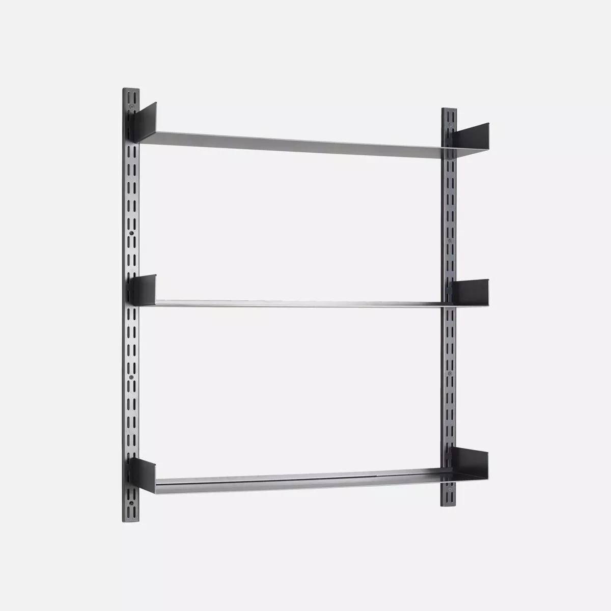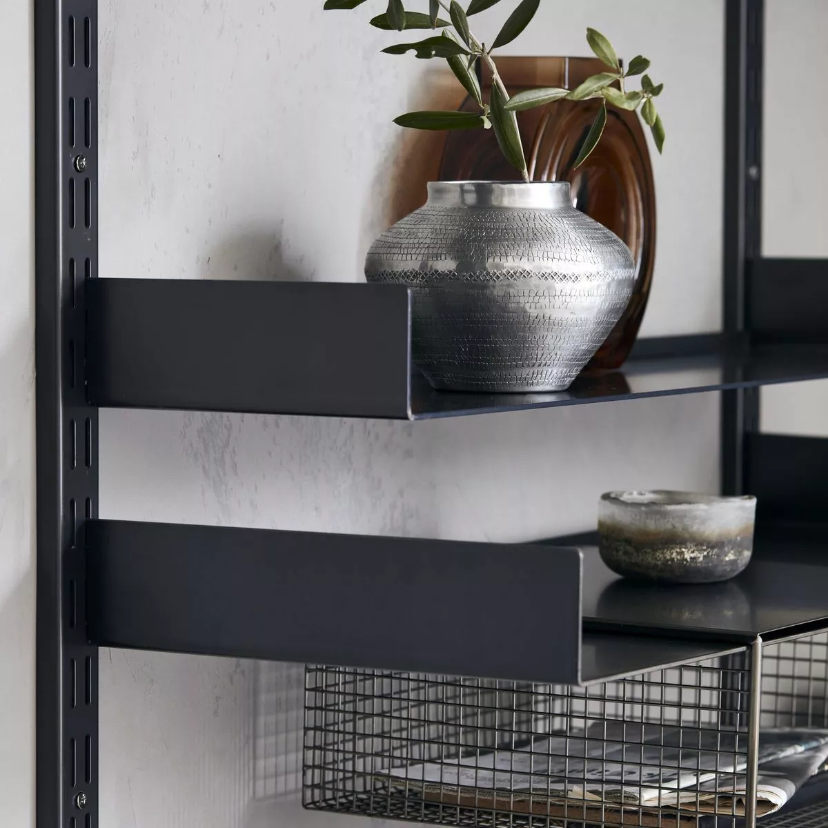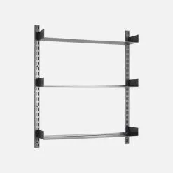 Öppna hyllor är ett dekorativt och väldigt praktiskt sätt att förvara dina saker. Fari från House Doctor ger hemmet en rå känsla med stålmaterial och svart beläggning. De 3 hyllorna är monterade på väggfästen och kan enkelt justeras om du behöver ändra höjden. De saker du tar hand om visas också och sticker verkligen ut på hyllornas släta yta. Placera Fari i köket och använd den till din favoritservis, eller i ditt vardagsrum dekorerat med gröna växter, dina favoritböcker och prydnadsföremål. Varje hylla tål upp till 15 kg.
