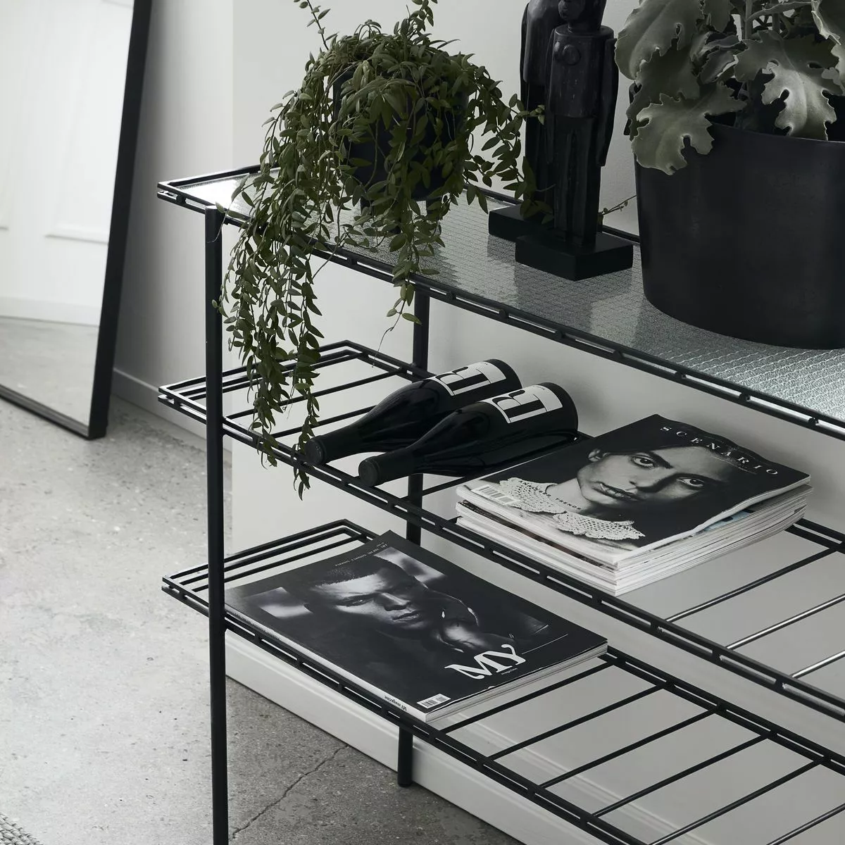 Få Gany-konsollen hvis du foretrekker et minimalistisk utseende og ren estetikk i hjemmet. House Doctor har designet det funksjonelle og praktiske møblet med en stålramme i et lett utseende og avsluttet med tre hyller. Plasser glassplaten på noen av hyllene, avhengig av hvordan du vil bruke Gany. Bruk hyllene uten glassplaten til magasiner, kurver, bøker, vinflasker og oppbevaringsbokser, og bruk den til vaser, planter, lysestaker og annen hjemmeinnredning. Enten du plasserer den i stuen eller gangen, er denne konsollen et funksjonelt og dekorativt valg. Maks vekt på glassplaten: 10 kg.