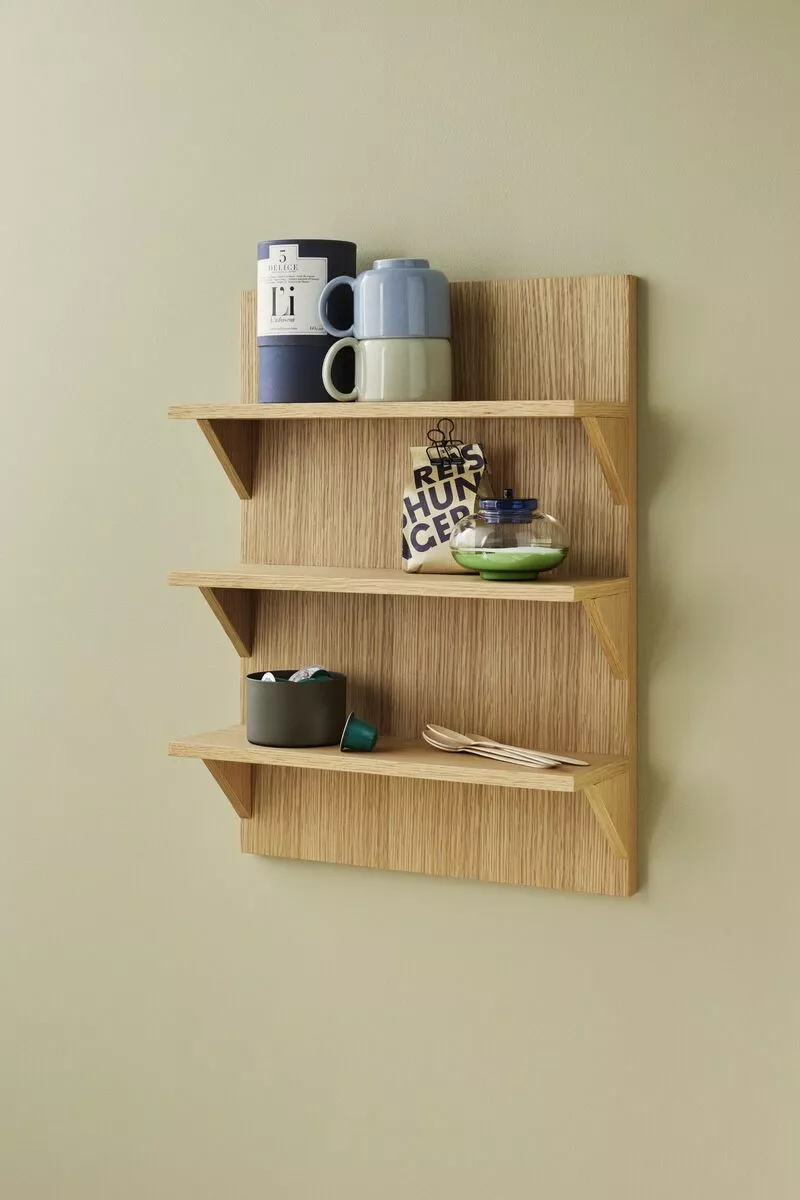 Vakker bokhylle i eik med tre hyller, perfekt for badet eller kjøkkenet for alle dine deilige kaffekopper.