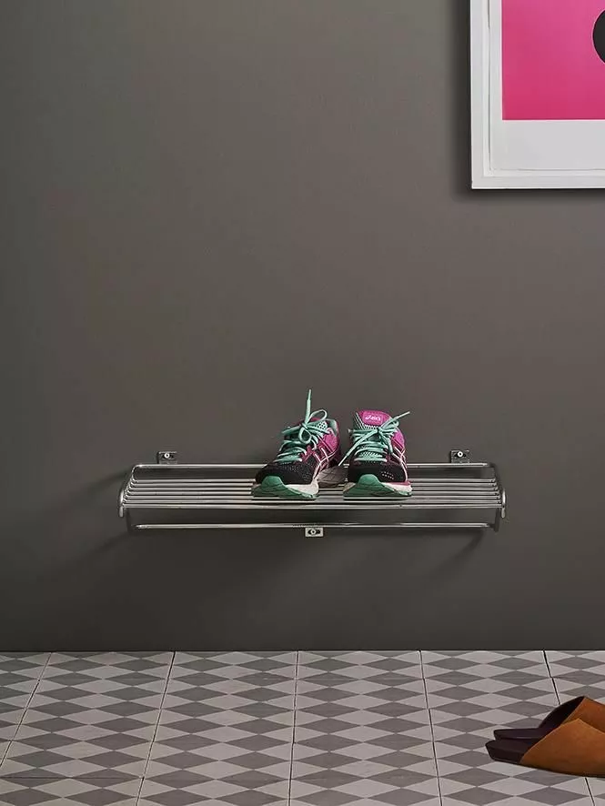 Shoe Shelf är en enkel och funktionell skohylla i metalltråd, vilket är tacksamt att dekoreras i både höjd och bredd. Finns det inte tillräckligt med utrymme för alla skor? Kombinera flera skohyllor ovanpå varandra, eller kolla in den utökade varianten Skohylla L.