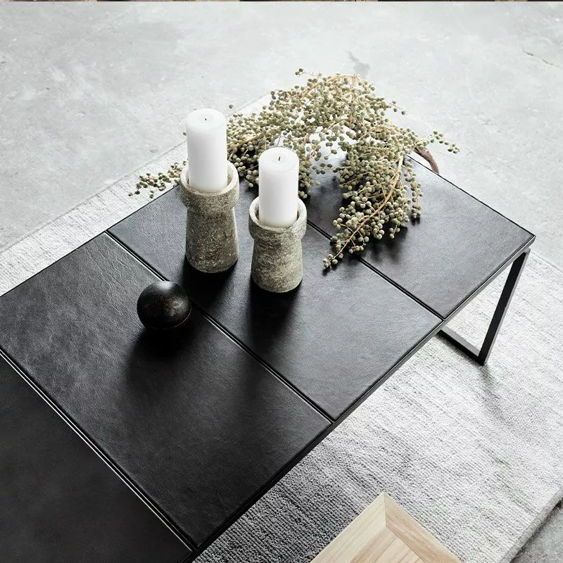 Bordet er laget av en jernbase som er pulverlakkert. Mens bordplaten er laget av paneler av jern og svart skinn. De forskjellige materialene på bordet skaper et vakkert og annerledes utseende som du bare må ta på.