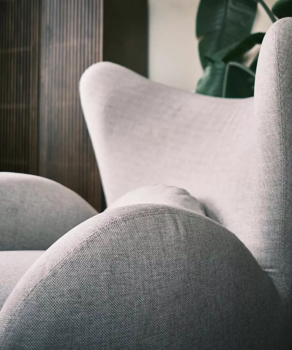 Denne varianten er trukket med et grått vevet stoff som etterligner lammeull.
