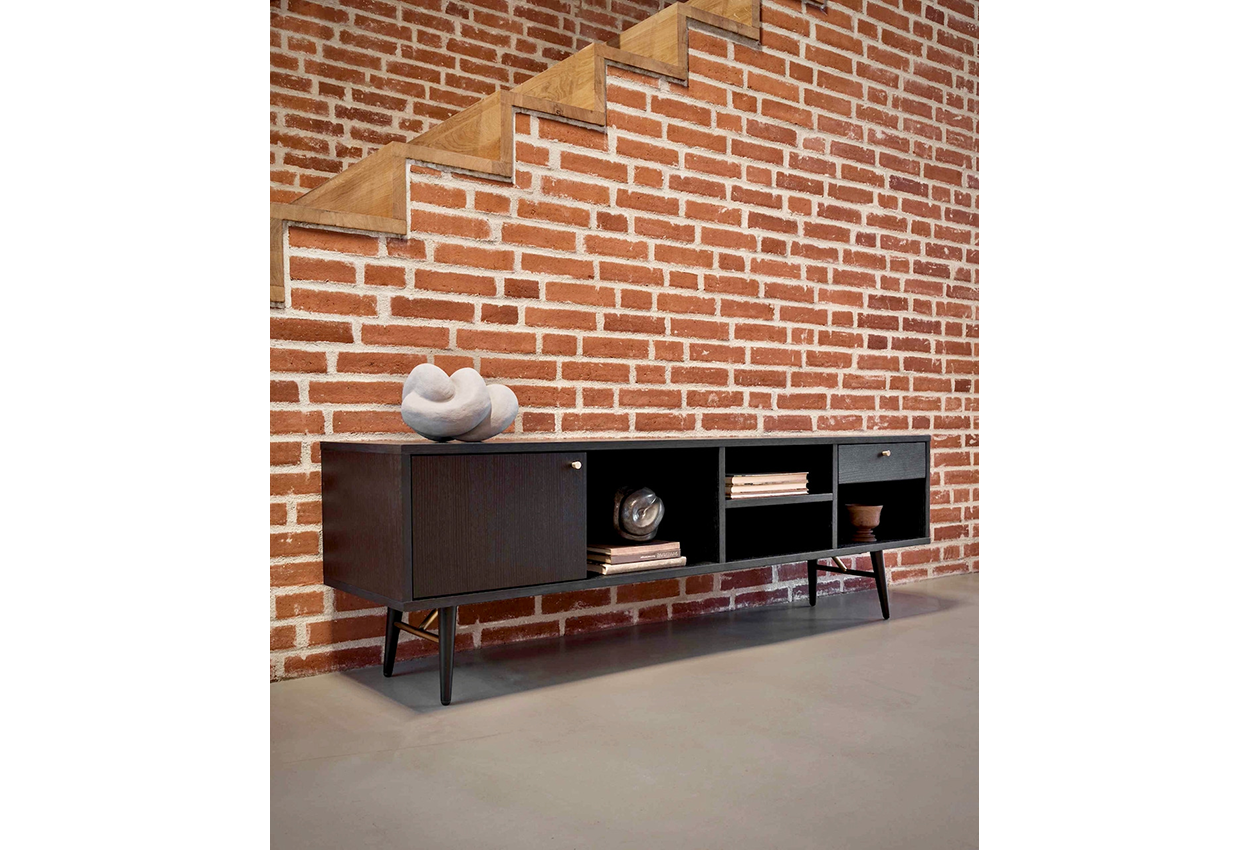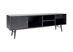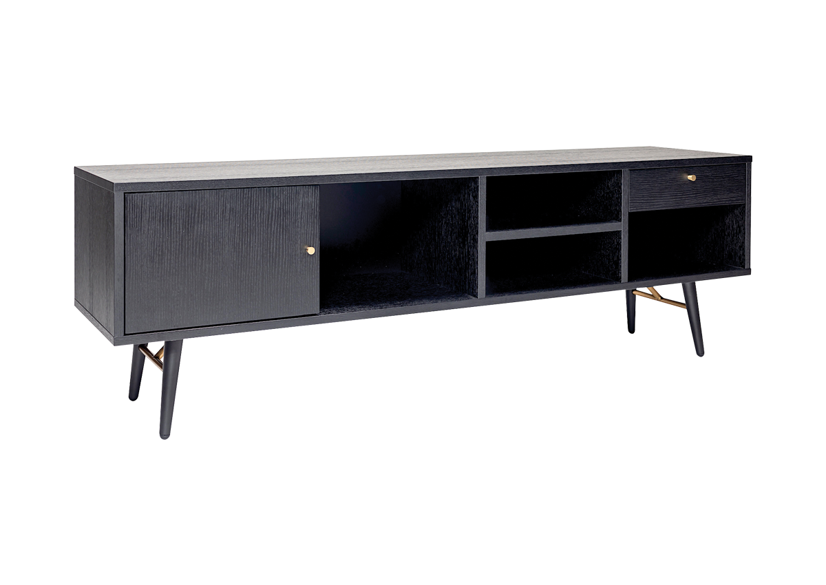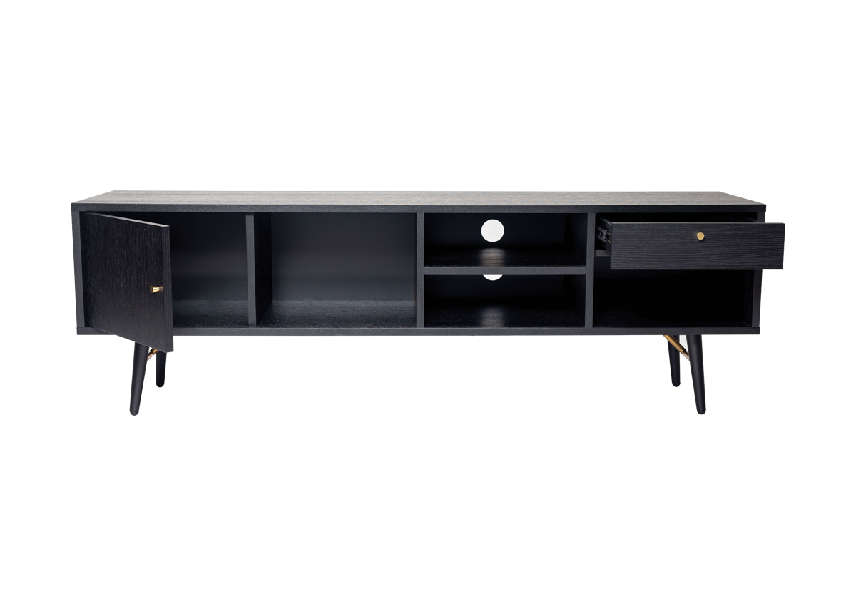 Svarte TV-møbler i eik fra Dawn-serien er laget med én skuff, én dør og 4 åpne rom i forskjellige størrelser. Bredden er 160cm, noe som gir plass til et stort fjernsyn og ting ved siden av fjernsynet.