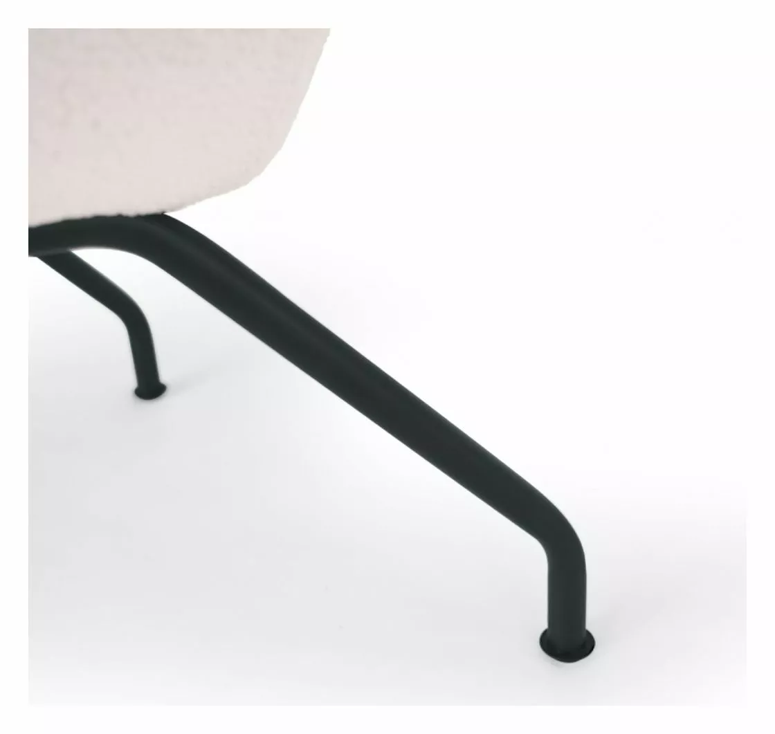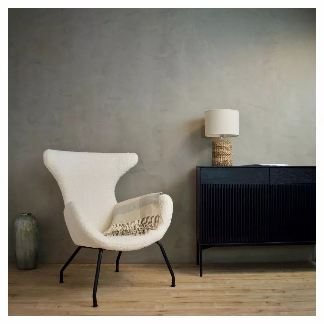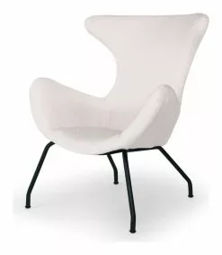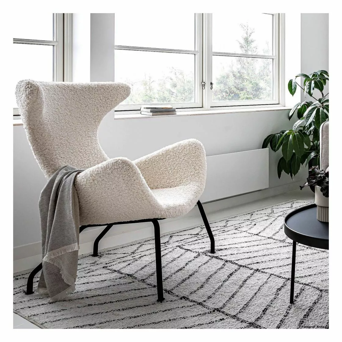 Den hvite Gaia-lenestolen er trukket med saueimitasjon (vegansk). Stolen har mattsvarte pulverlakkerte metallben med filtputer under for å beskytte gulvet. Gaia lenestolen er et elegant møbel som passer perfekt inn i det moderne nordiske hjemmet.