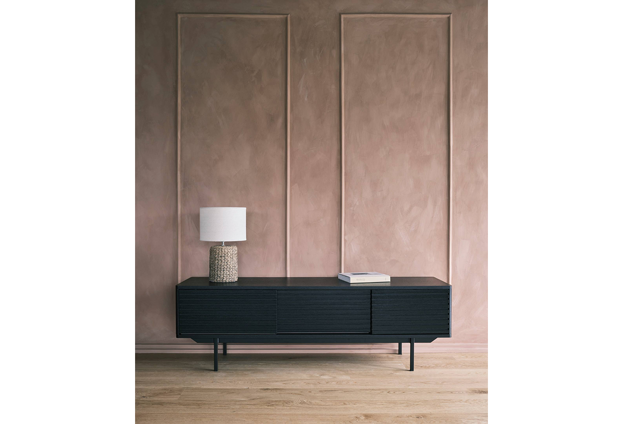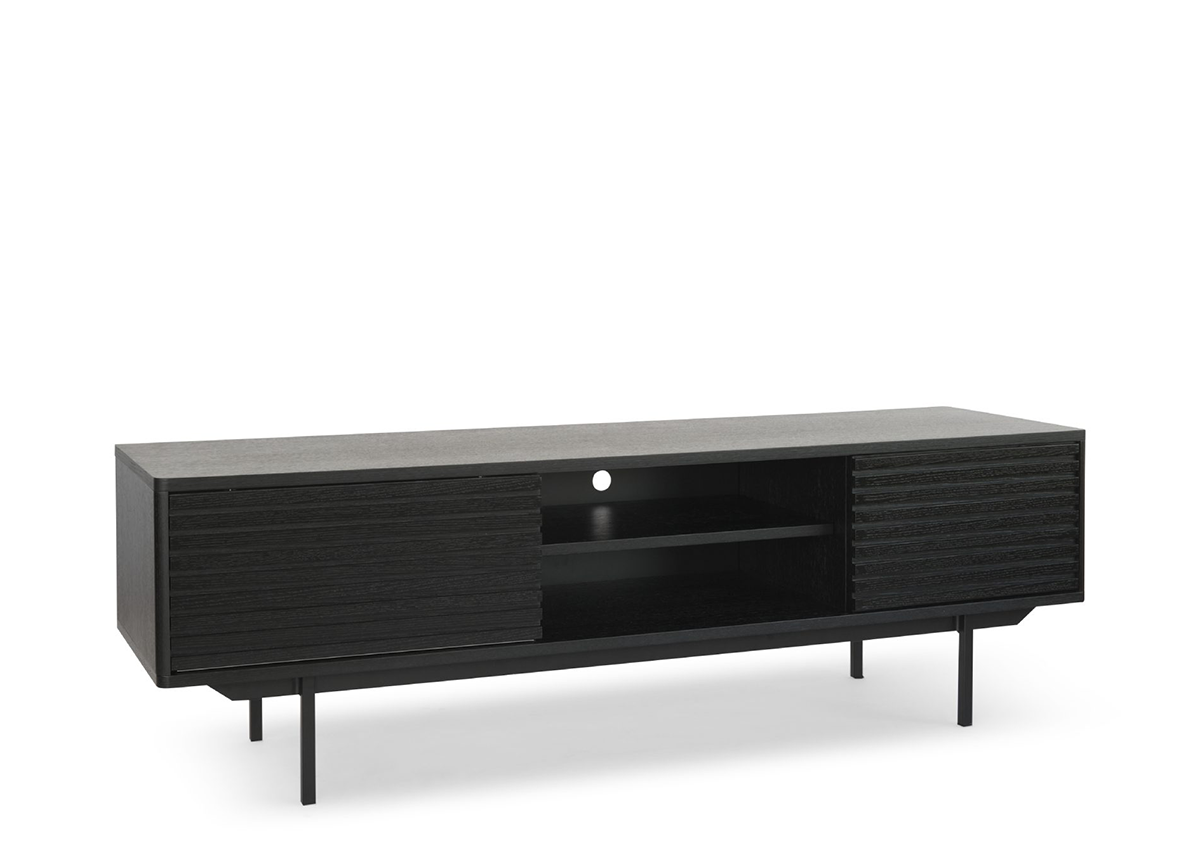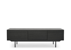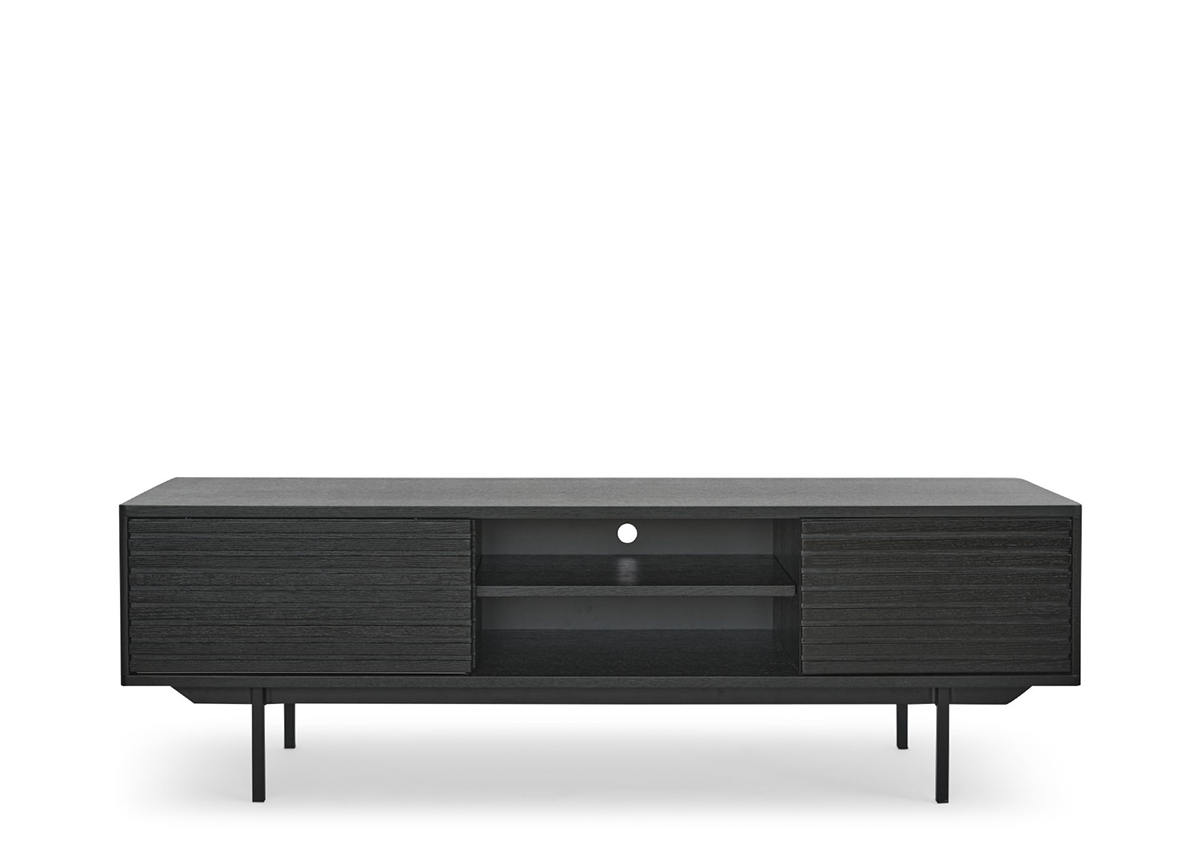 Mat sort tv-møbel i egetræ fra Sense-serien. Træmøblets indre kerne består af MDF fiberplader. Benene og understellet er pulverlakeret med en flot sort farve. Tv-bordet har to små rum med én ”push-to-open” låge, ligeledes har møblet to skydedøre, som dækker de to større rum. Hylderne i alle rum kan tages ud for at gør tv-bordet ekstra rummelig. I midten af tv-møblet er et hul til kabelføring. Tv-bordets bredde er 160cm, hvilket giver plads til et stort fjernsyn og ting ved siden af fjernsynet.