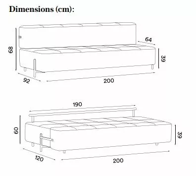 Mått: L: 200 cm D: 92/120 cm SD: 64 cm H: 68 cm SH: 39 cm