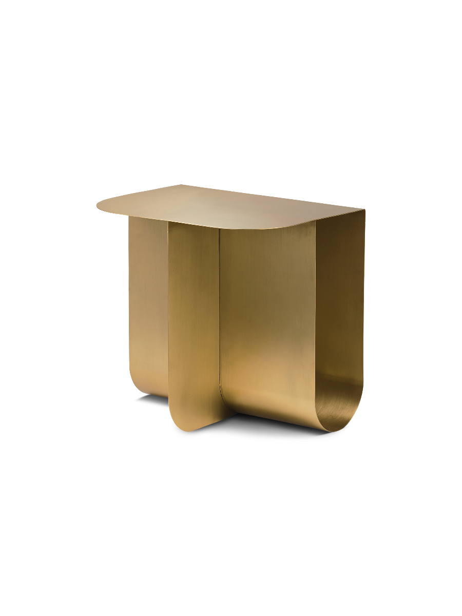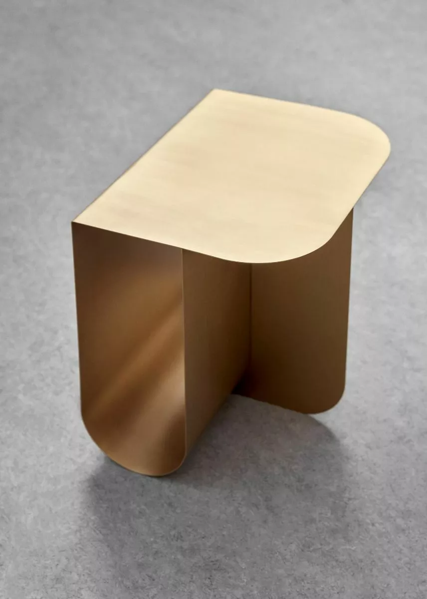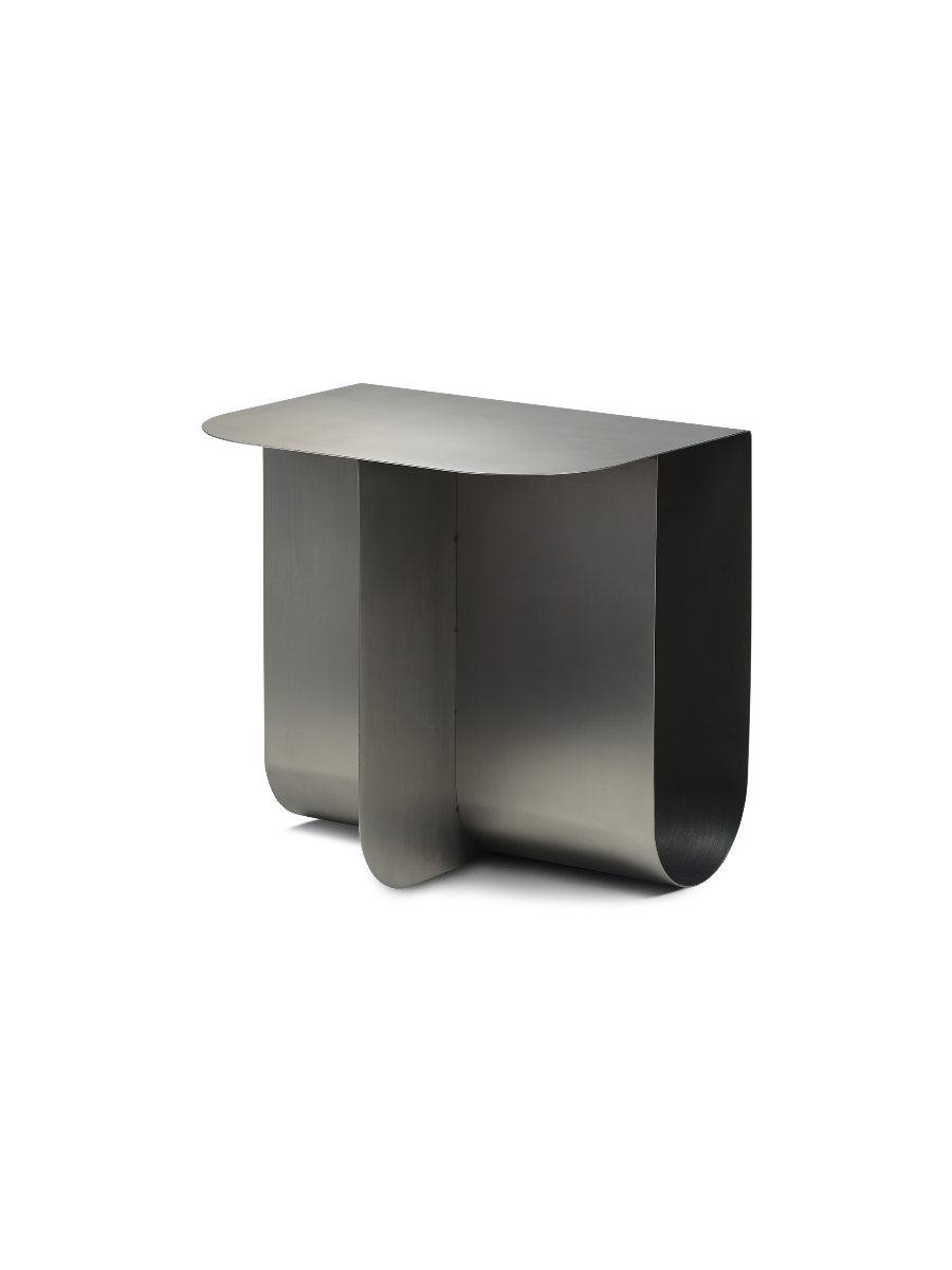 Utrymmena markerar elementen som placeras istället för att dölja dem från vyn och bildar en unik kombination av lagring och skärm. Ljus passerar genom bordet och skapar subtila skuggor som förvandlar ytornas utseende. Bordets fyrsidiga form är uppbyggd av två metallplattor vikta i en design. Mass finns i mässing, rostfritt stål och med en svartlackerad yta och ger ett kompakt, platsbesparande alternativ till stora mönster.
