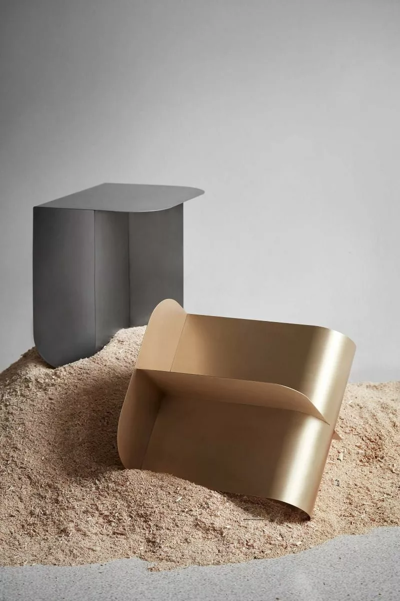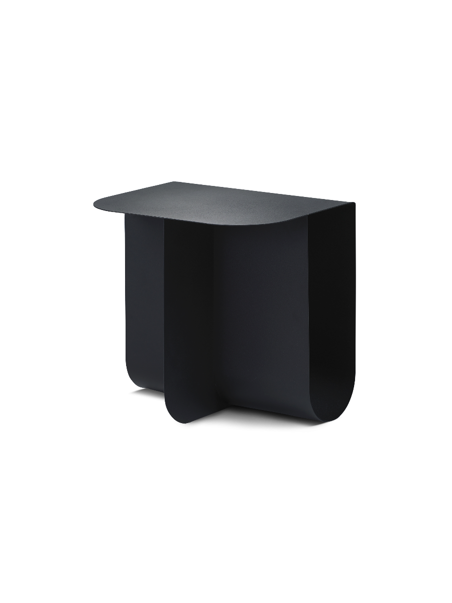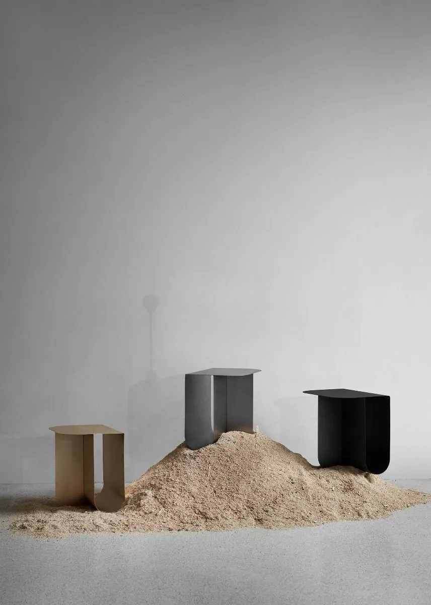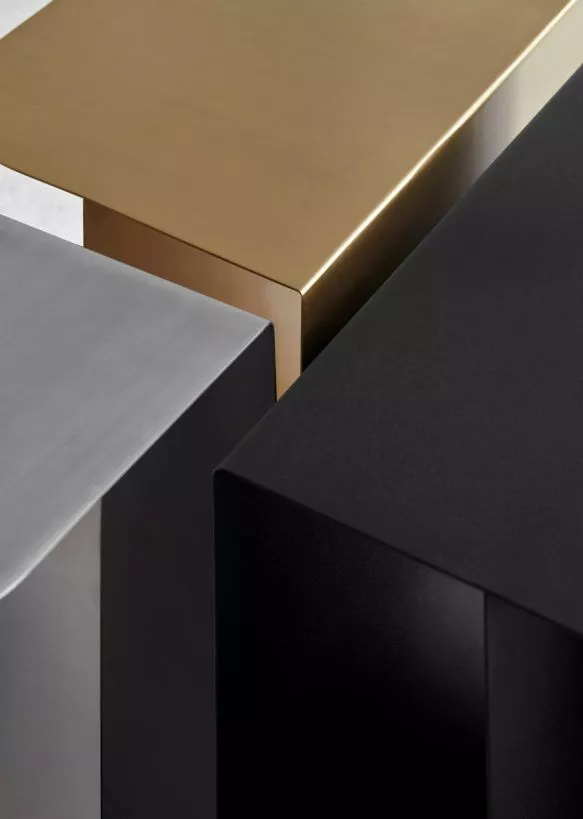 Utrymmena markerar elementen som placeras istället för att dölja dem från vyn och bildar en unik kombination av lagring och skärm. Ljus passerar genom bordet och skapar subtila skuggor som förvandlar ytornas utseende. Bordets fyrsidiga form är uppbyggd av två metallplattor vikta i en design. Mass finns i mässing, rostfritt stål och med en svartlackerad yta och ger ett kompakt, platsbesparande alternativ till stora mönster.