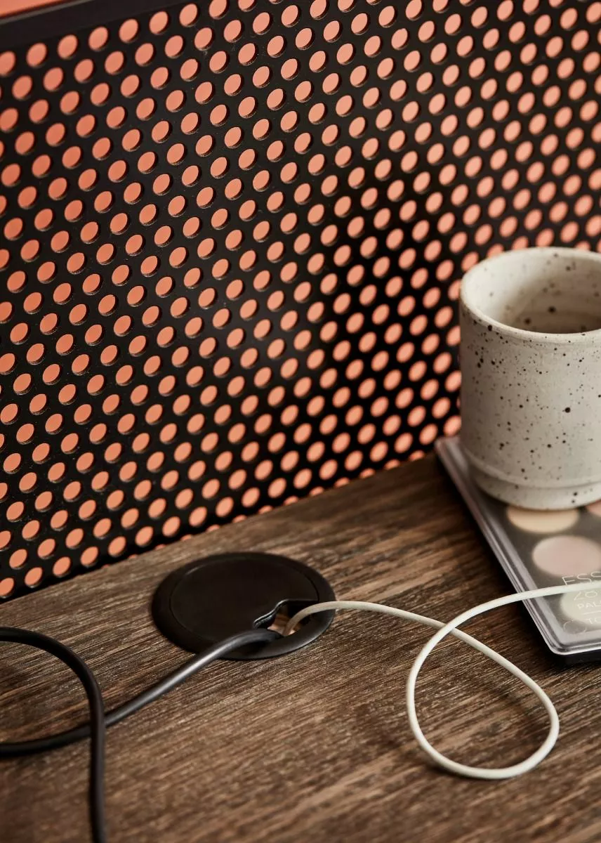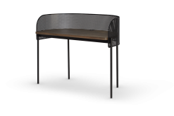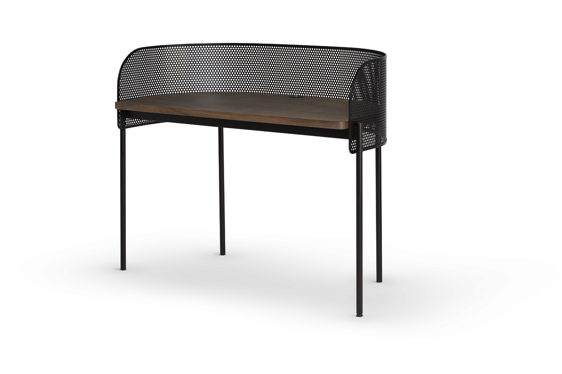 Bordsskivan är omgiven av perforerat stål och bildar en ljus skärm som sveper runt framsidan och sidorna. Själva ytan är gjord av en rökt fanértopp uppburen mellan benen i stål.