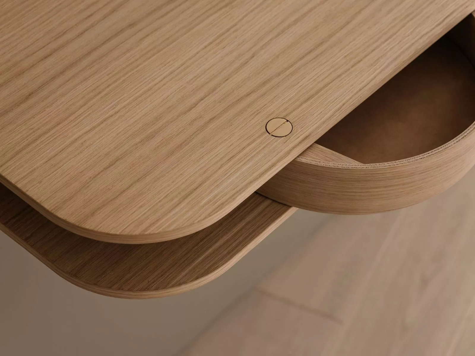 Tilgjengelig i en lysoljet eik, røkt eik eller svartmalt eik, har skuffens bunn også Sørensen -skinndetaljer som gir et taktilt skille.