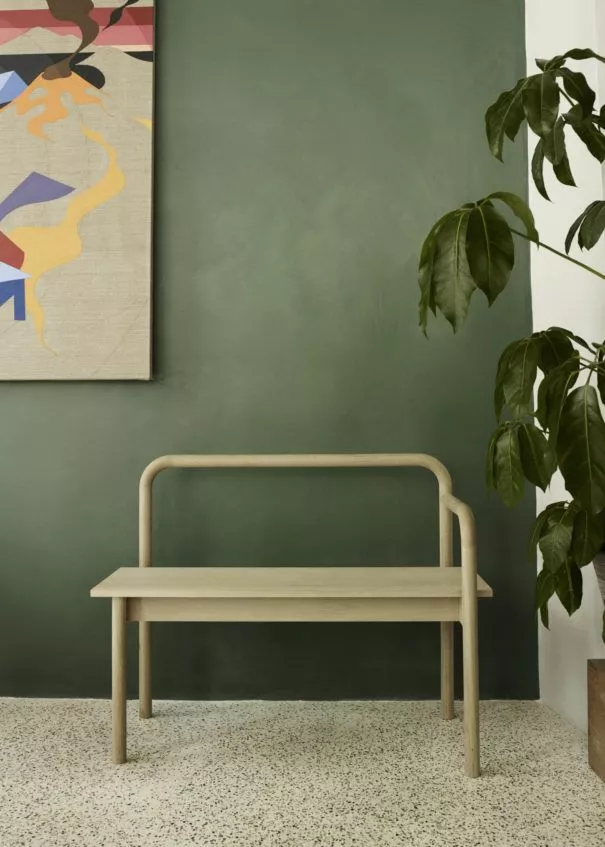 Rund men ändå kantig. Maissi är en konstnärlig bänk med två personer inspirerad av ledstänger från gamla trappor och industrimaskiner. Den smala stilen och de rena snitten gör den perfekt för att välkomna gäster i korridoren eller som en extra plats i vardagsrummet.