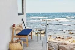 En enkel och lekfull bänk tillverkad av FSC-certifierad teak. Från toppen av ryggstödet kör två horisontella bord, perfekt för att placera ett dricksglas, små blomkrukor eller en lykta på natten.