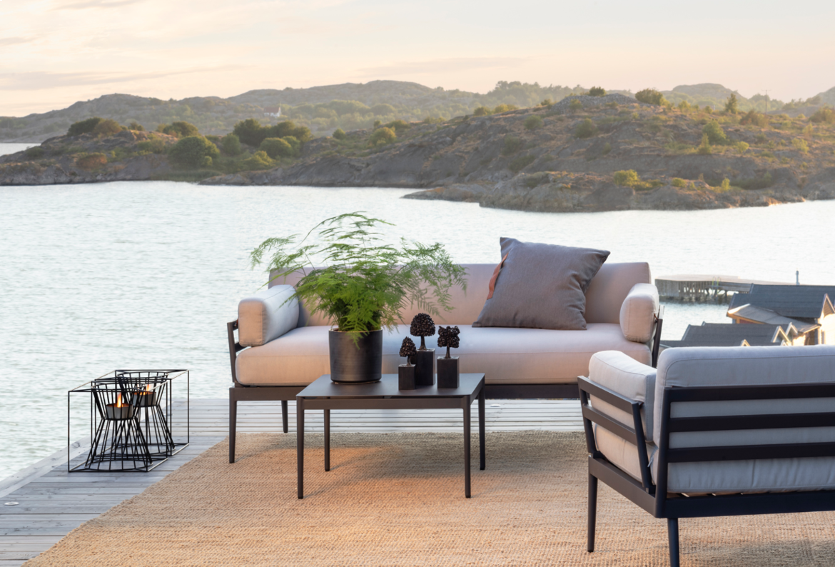 Ett urval av modulära loungemöbler, gjorda av aluminium, med kuddar i Sunbrella-tyg täckt med högkvalitativ utomhusskumfyllning. Eller uttryckt på ett annat sätt, ett sortiment som ser bra ut och också är underhållsfritt.