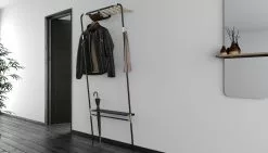 Lean On Me klädhängare – utrymme att förvara Lean On Me klädhängare låter dig bekvämt lagra alla dina utomhusprodukter samtidigt som du fortfarande utnyttjar det tillgängliga utrymmet. Lean On Me är utformad för att luta sig i en vinkel från väggen vid basen och tar nästan inget utrymme på golvet. Perfekt för smala korridorer och andra ställen där rummet är tätt, dess huvudvridningsdesign gör det till en imponerande bit att hälsa besökare i hemmets viktiga entréområde.