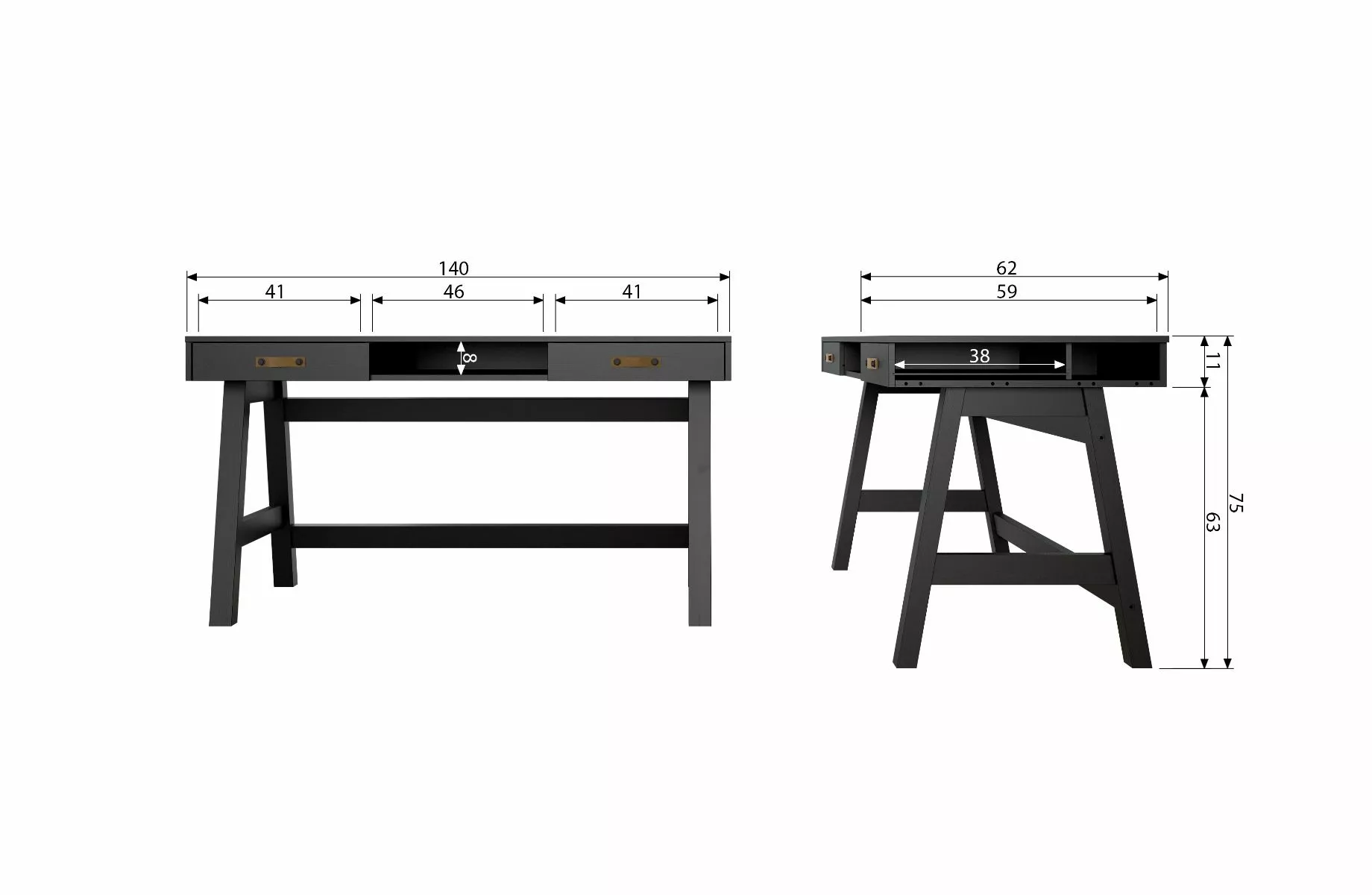 Dian -skrivebordet er 75 cm høyt, 140 cm bredt og 62 cm dypt. Skuffene er 45 cm brede, 38 cm dype og 7 cm høye. Oppbevaringsrommet er 50 cm bredt, 62 cm dypt og 7 cm høyt.
