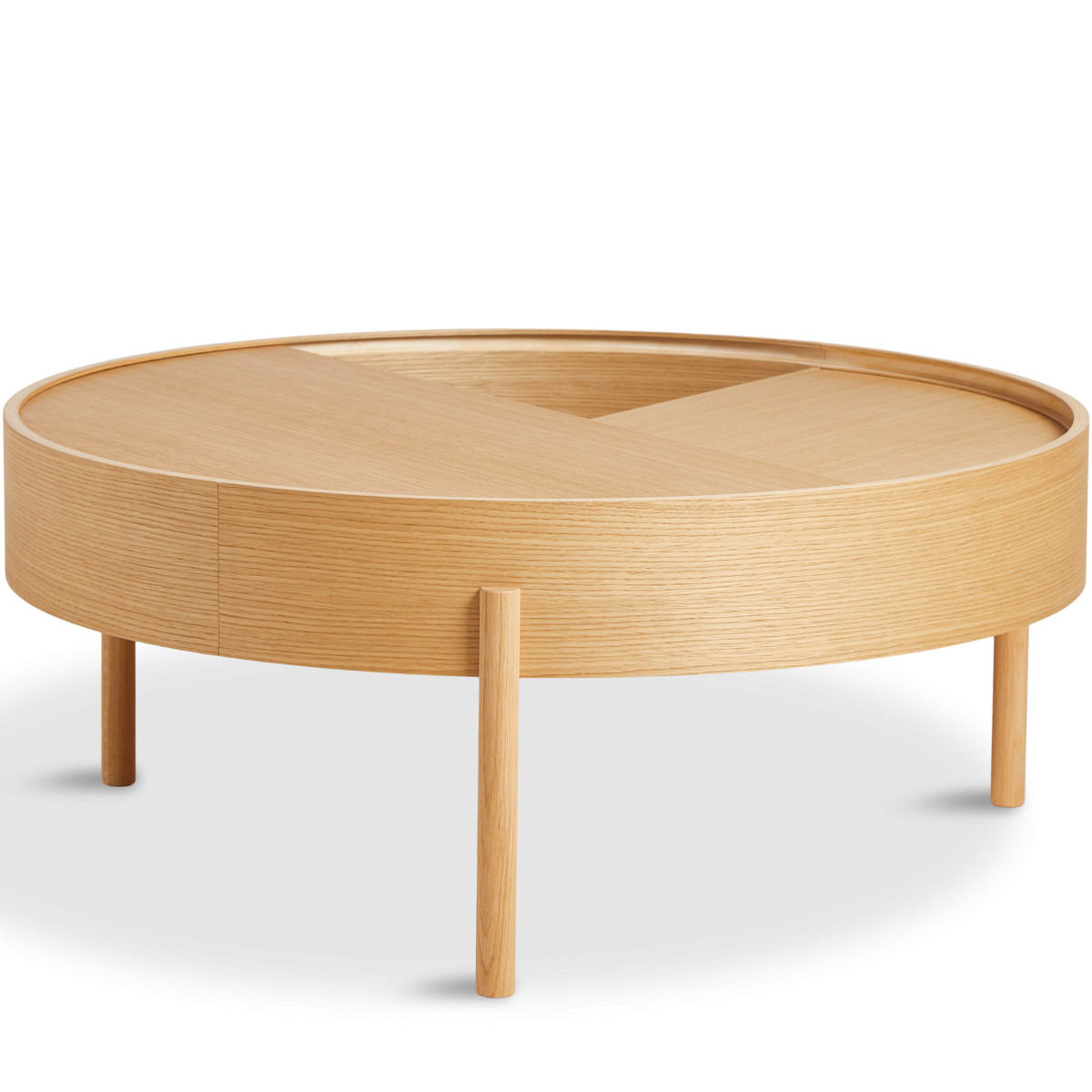 ARC har fått sitt namn från det matematiska konceptet med en jämn kurva som förbinder två punkter i en cirkel. ARC-bordet inbjuder användaren att använda de enkla funktionerna, använd ett finger för att vrida den övre bordsskivan. Lämna den öppen med dina favoritföremål på skärmen, eller stäng locket för att dölja röran. Ytan inuti förvaringsutrymmet är täckt med ett slätt nanolaminat som kompletterar askträet, medan den trebenta konstruktionen ger den lekfulla och lätta touchen till den geometriska formen.