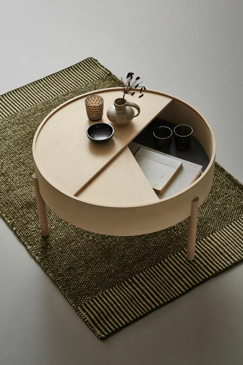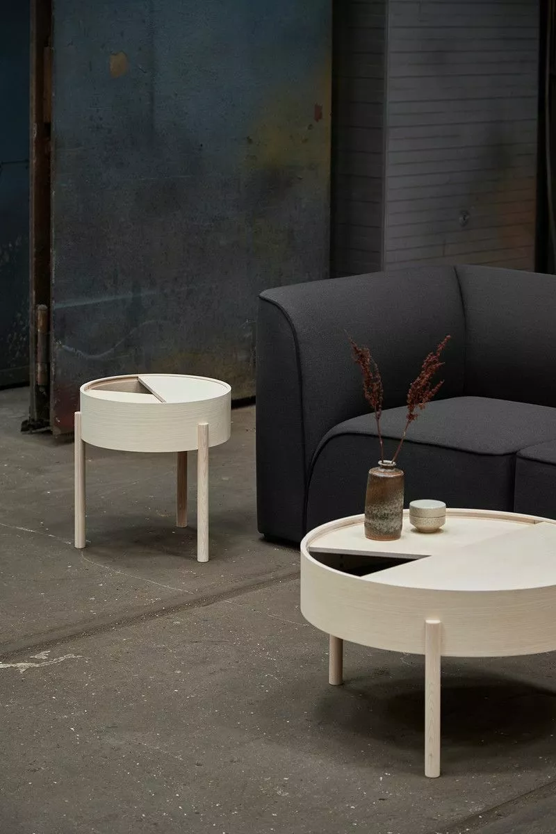 ARC tar sitt namn från det matematiska konceptet med en jämn kurva som sammanfogar två punkter i en cirkel. Designarna bakom Arc ville skapa en vacker bordsserie med utrymme för att dölja din röra. Genom att helt enkelt vrida hälften av det cirkulära locket kan bordets uttryck ändras. Ytan på det inre förvaringsutrymmet är täckt med ett slätt nanolaminat för att komplettera askveden medan den trebenta konstruktionen ger en lekfull och lätt touch till den geometriska formen.