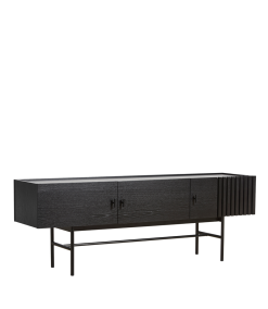 De smala benen lyfter skänk från marken och skapar en elegant kontrast mellan det massiva träskåpet på toppen och den tunna metallkonstruktionen nedan. Funktionell förvaring på insidan och mjuka stängda dörrar gör skåpet både funktionellt och vackert.