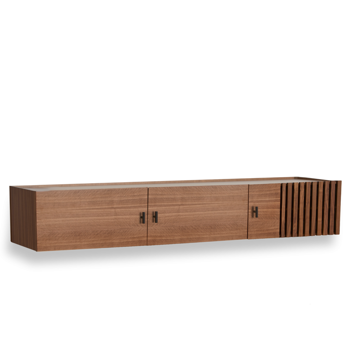 Array-serien är inspirerad av träskifferbeklädnaden som finns i modern arkitektur. Med sin geometriska form och horisontella lameller skapar den en stark visuell effekt av att fånga både ljus och skugga i djupet av lamellerna. De smala benen lyfter skänkarna från marken och skapar en elegant kontrast mellan det massiva träskåpet upptill och den tunna metallkonstruktionen under. Mjukt stängda dörrar gör skåpet både funktionellt och delikat.