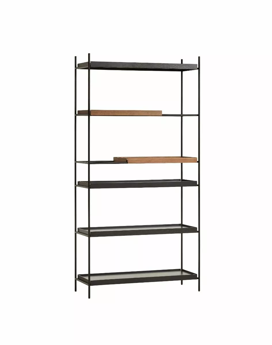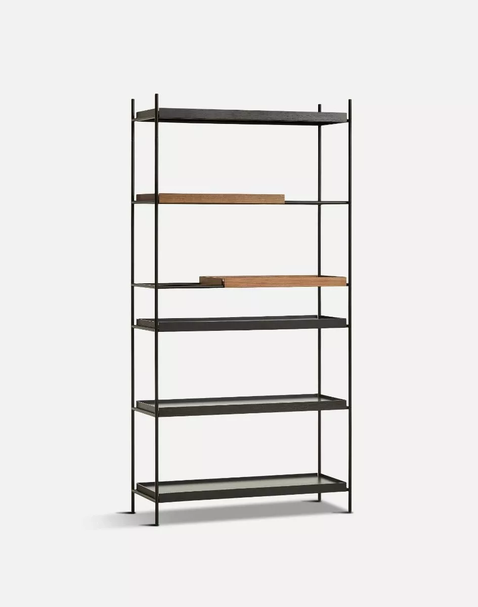 Tray Shelf er et levende hyllesystem med rette linjer, estetisk symmetri og enkelt uttrykk. Designet for å lage ulike mulige arrangementer av brettet som gjør hyllesystemet dynamisk og personlig ved å velge din favorittbrettkombinasjon. Ta brettene og plasser dem på de forskjellige nivåene i rammen. Huller i hyllesystemet skapes ved å flytte de små skuffene, som gjør at høyere gjenstander kan plasseres i det åpne rommet.