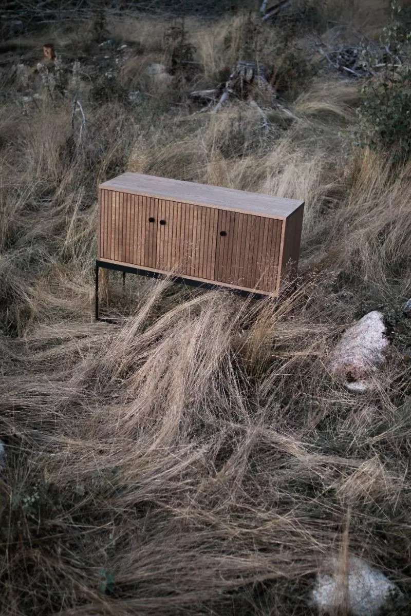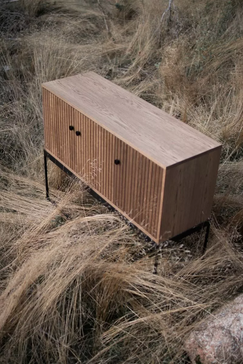 I Dis skjenk og skap er kombinasjonen av overdimensjonert og minimalistisk en kraftig selvmotsigelse. Solid håndverk og ærlige eikematerialer kompletteres av en pulverlakkert stålramme.