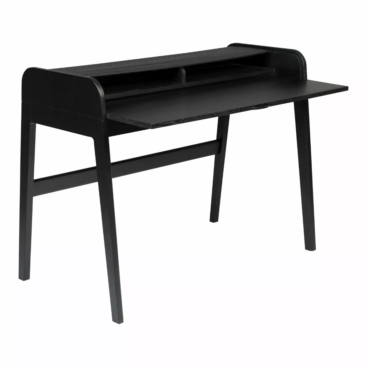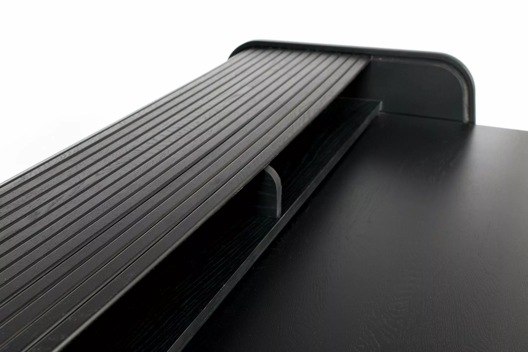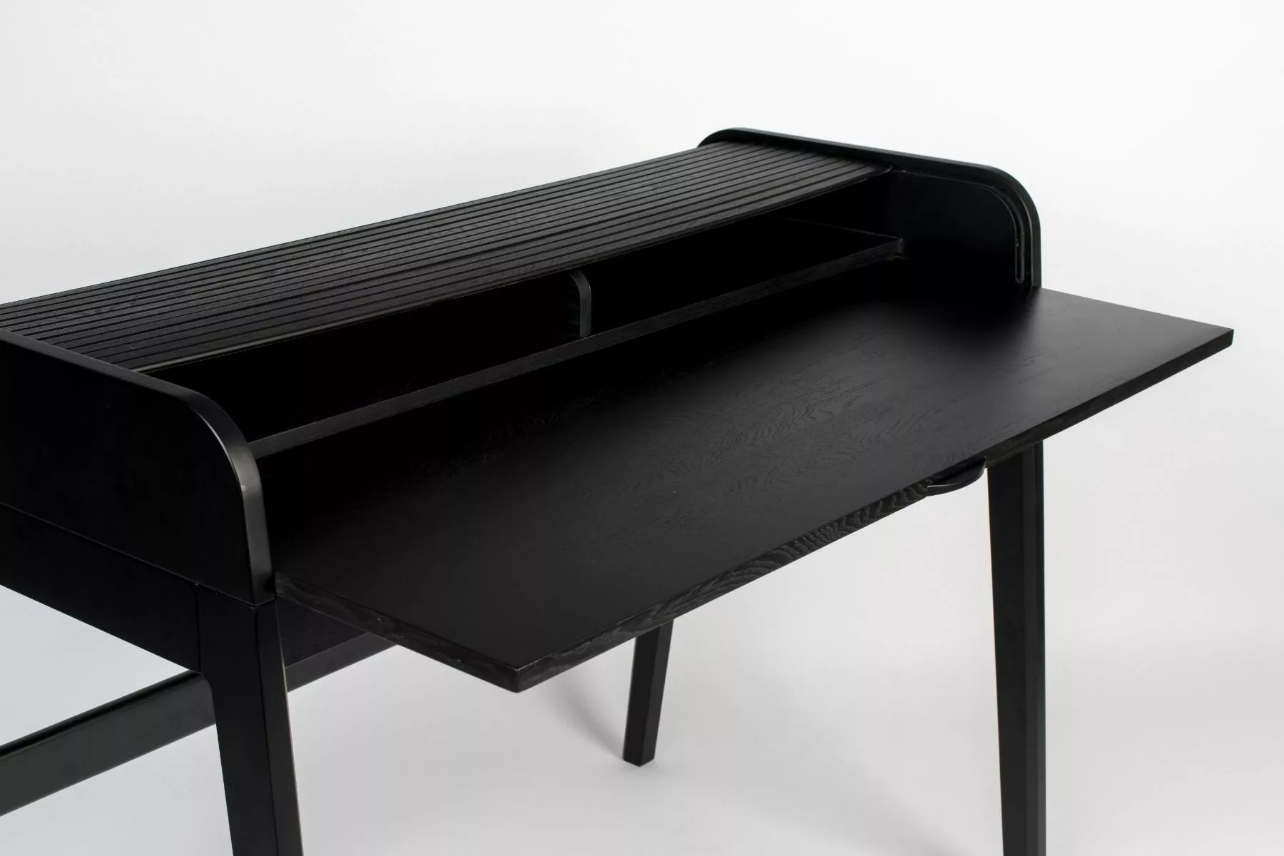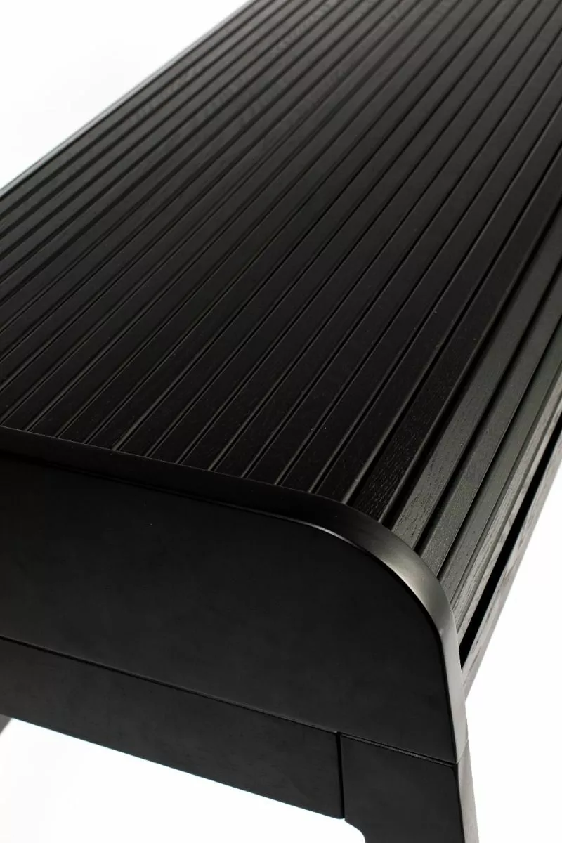 Notat 18 mm ask finert MDF-sider og uttrekkbar bordplate, massiv asketre tambourrulle og ben
