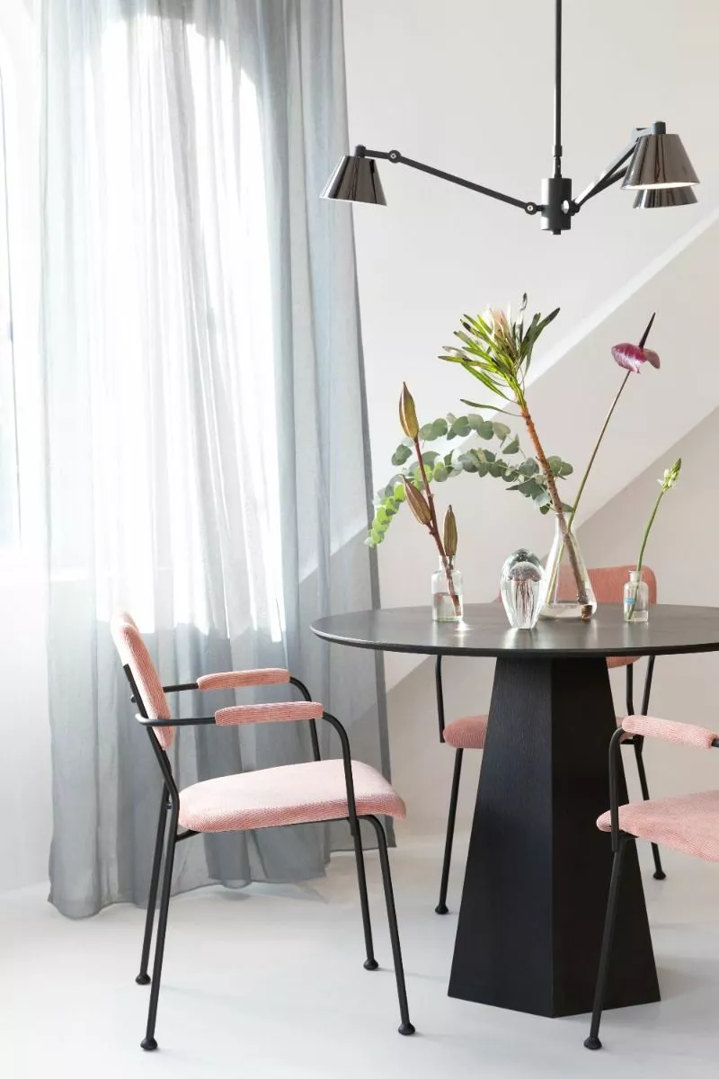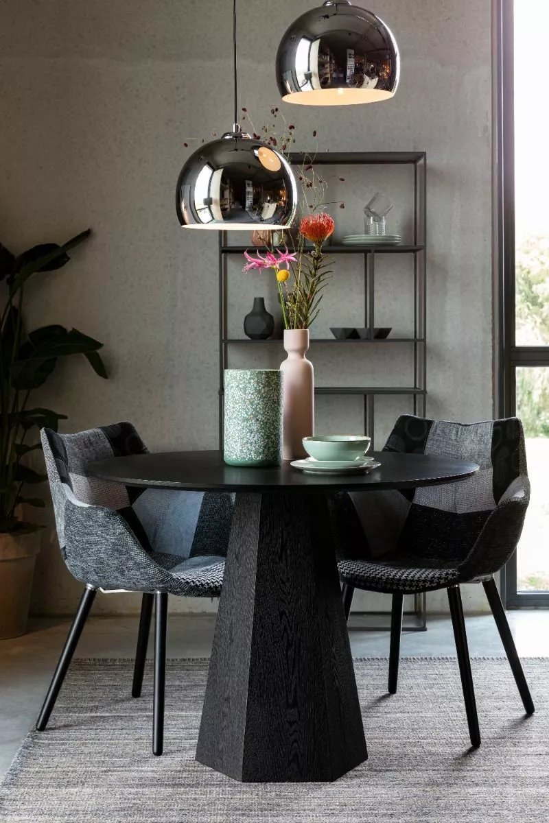Et rundt spisebord med kantete former i bunnen. En fin kontrast som gjør Pilar så tiltalende.